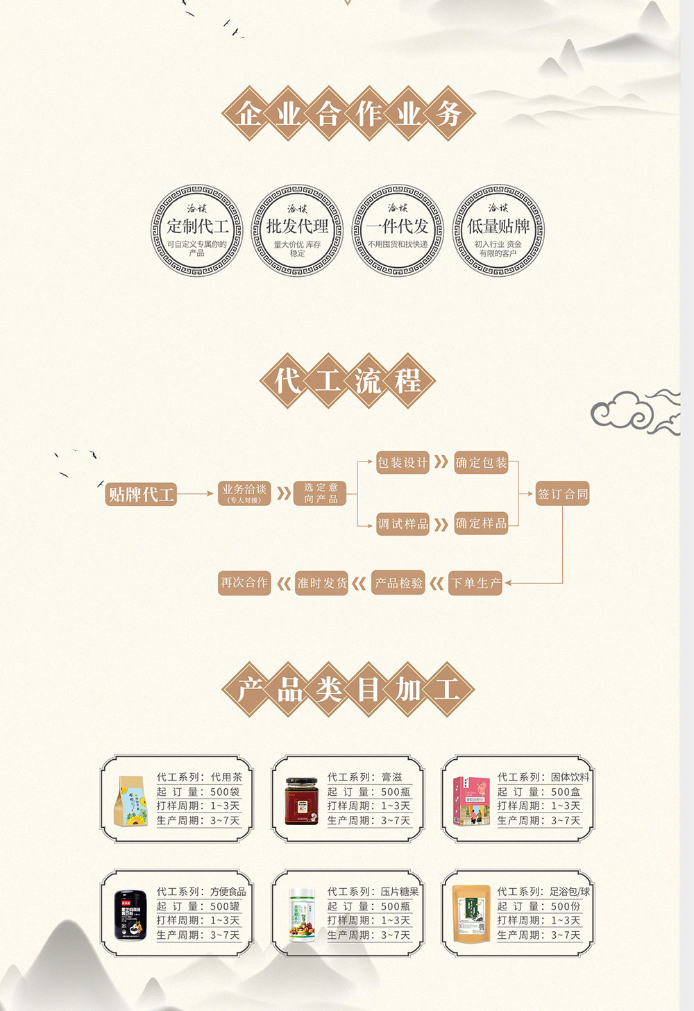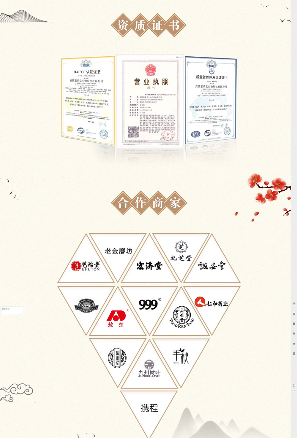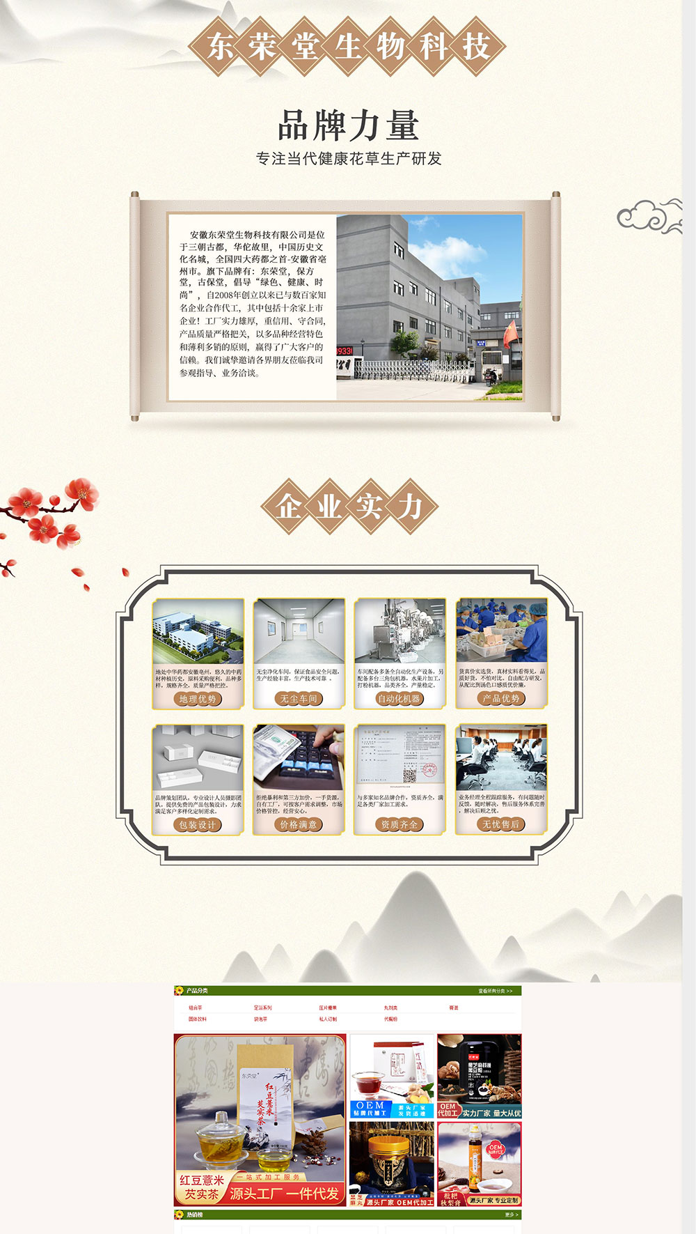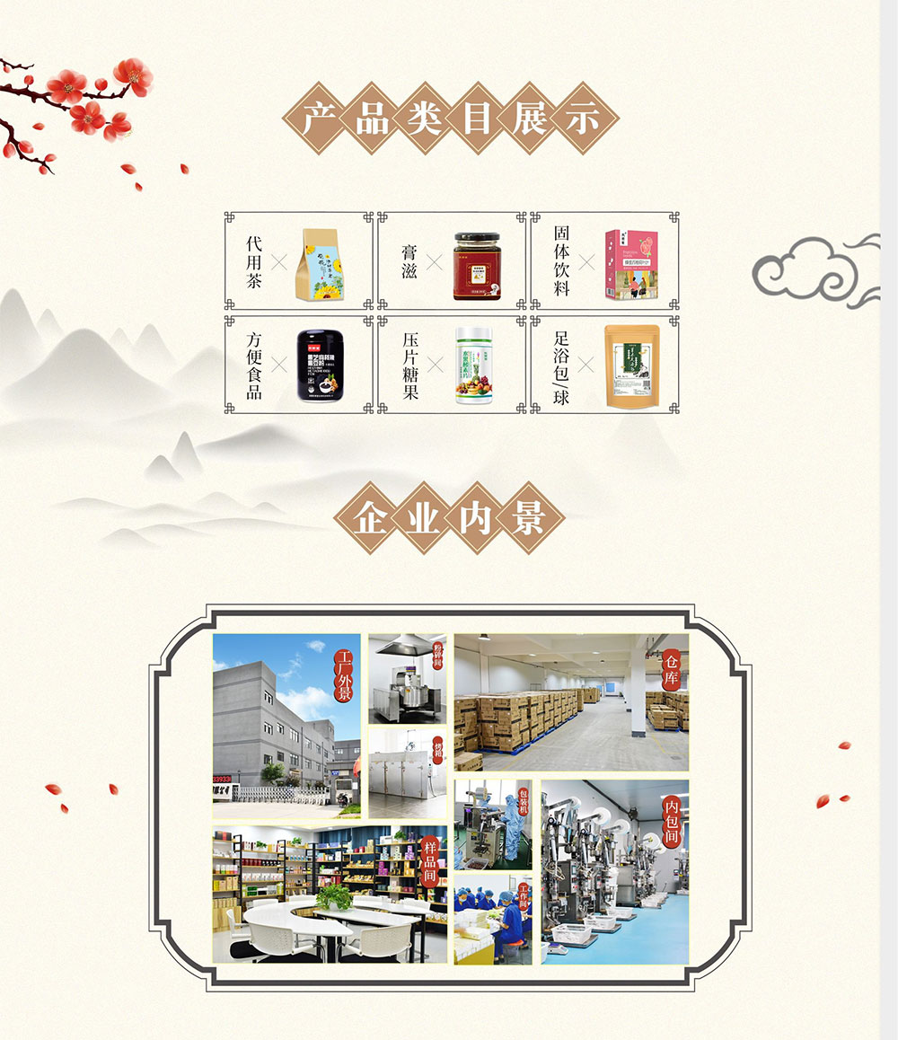 安徽東榮堂生物科技有限公司簡稱(東榮堂)成立于2017年,注冊資金1700萬,坐落于全國四大藥材之鄉的安徽亳州。自建廠房面積35000平方,斥資1.5億元;現有質量檢測人員15人,技術人員50人,工人500人,具有先進工藝生產流水線80條,年生產能力2億5千萬件;所產產品銷往全國各地,與各大上市公司長期合作;主營業務包含養生花茶、固體飲料、代餐粉、膏滋類、壓片糖果等養生產品,集產品設計、研發和生產于一體的專業代加工工廠;榮獲ISO9001質量體系認證、HACCP食品管理體系認證等。 我們的經營理念是:誠信為本,堅持一流管理,生產一流產品,提供一流服務!
