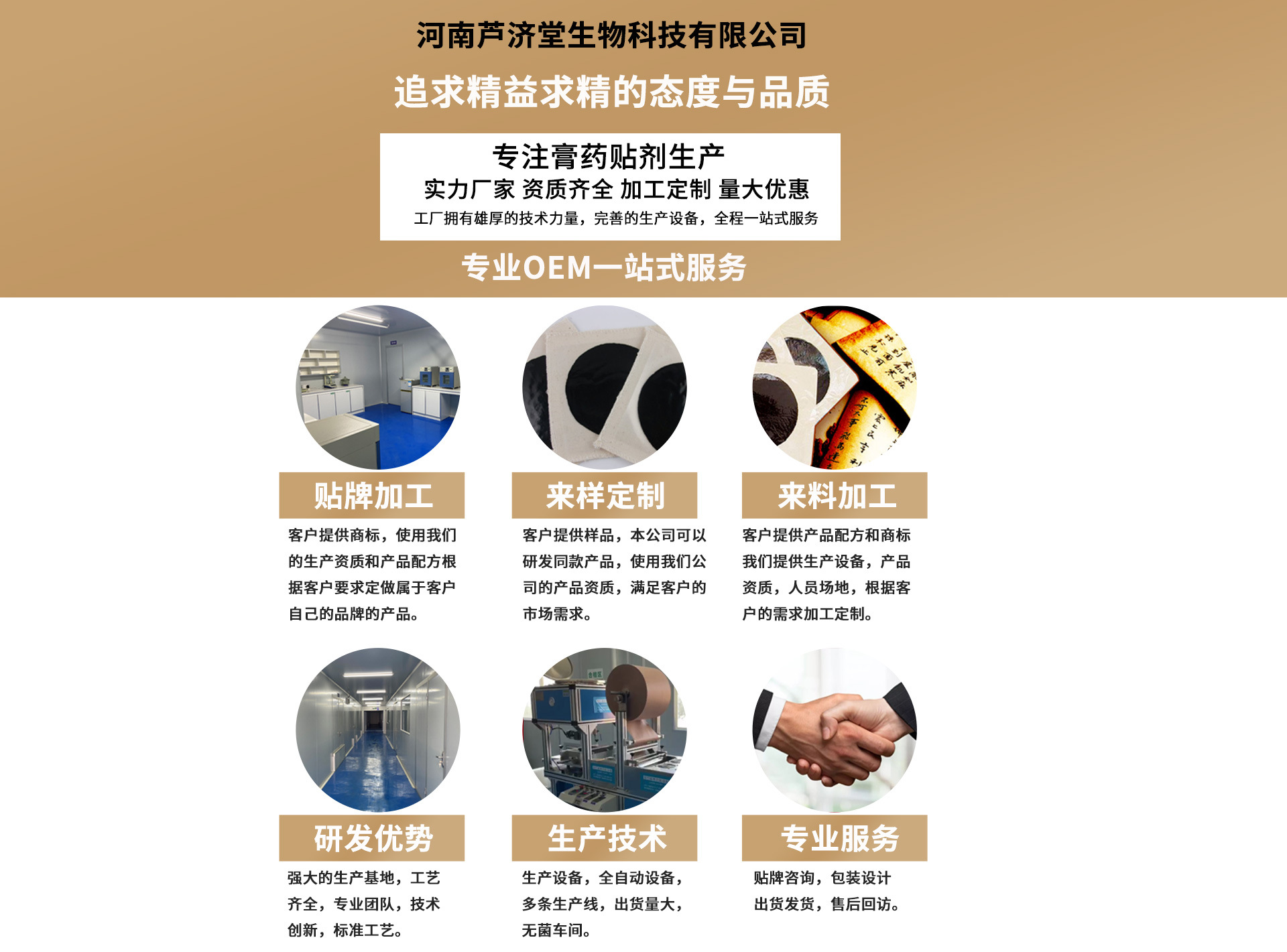 河南蘆濟堂生物科技有限公司是一家集研制專注膏藥貼劑生產、 銷售為一體的生產批發型企業 。工廠擁有8000平方米的生產車 間、設備先進,工藝合理, 質量可靠。工廠采用國際優秀管理 標準, 環境標準 CMPC 10萬級車間。 公司秉承“團結同心、合 作共榮、 科技創新、 成就健康”的人文理念, 將透皮吸收理論 轉入工業生產, 將中國傳統文華精髓和先進科技相結合, 努力 為人類幸福生活服務。 以市場為導向爭當行業先鋒 ,鑄就一流 品牌。歡迎各界朋友蒞臨參觀、指導和業務洽談。