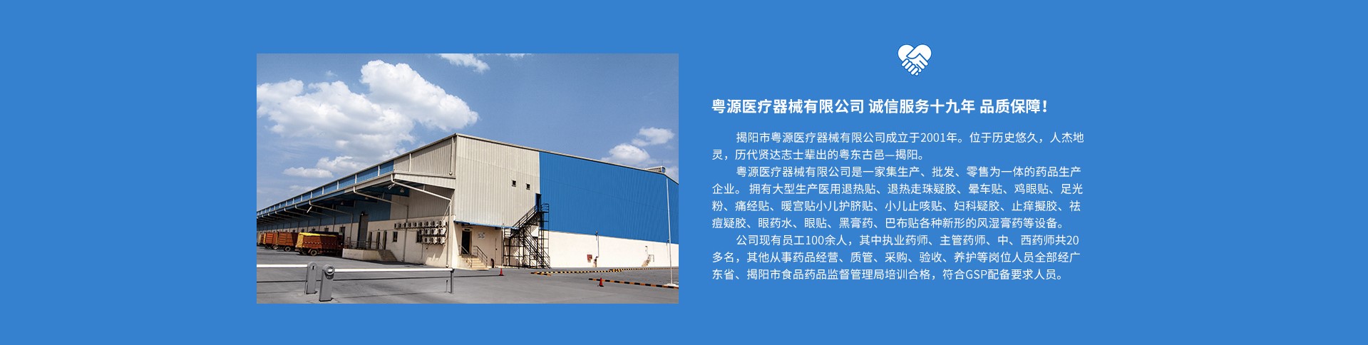 揭陽市粵源醫療器械有限公司是一家集科研、生產、銷售為一體的現代化高新技術企業,于2010年新批器械文號,通過貫徹執行標準的質量管理體系及管理模式下,使公司產品質量在每個環節都得到嚴格控制和有效保障;公司設備齊全,工藝流程按照國家潔凈標準進行設計管理,擁有大型生產退熱貼、暈車貼、黑膏藥、巴布貼各種新形的風濕膏藥等設備,具有完善的質量管理體系,加上合理的價格、優質的服務、競爭力強的產品,使公司產品備受廣大消費者的信任和青睞,銷售網絡遍布全國,同時長期對外貼牌加工各種外用貼劑。