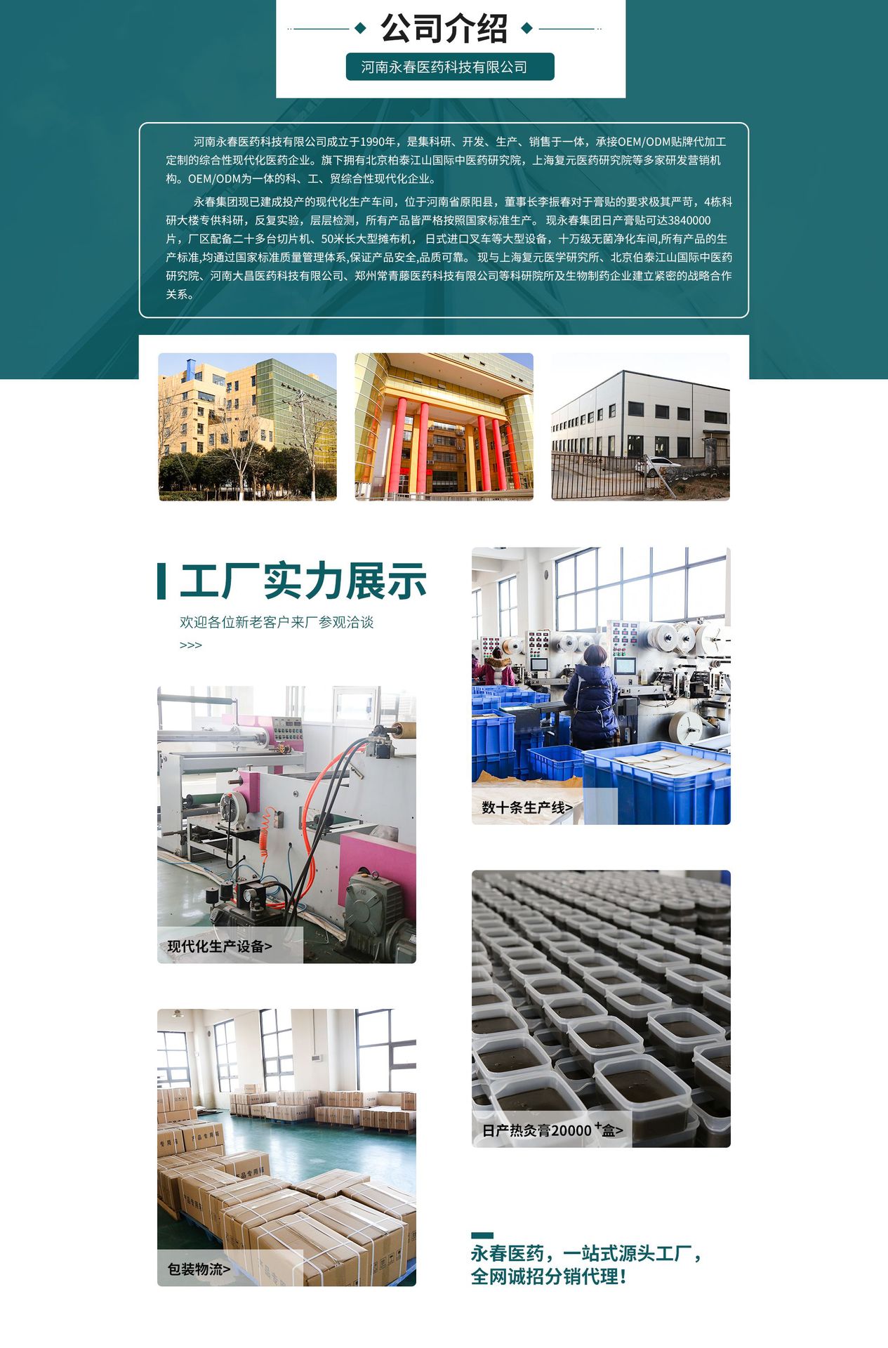 河南省永春醫藥科技有限公司成立于1993年,經營范圍:醫藥產品、消毒用品的研發、咨詢;保健用品、保健食品、醫療器械的生產、銷售;是一家集生產、服務、OEM/ODM為一體的科、工、貿綜合性現代化企業。 永春集團現已建成投產的現代化生產車間,位于河南省原陽縣,董事長李振春對于膏貼的要求極其嚴苛,4棟科研大樓專供科研,反復實驗,層層檢測,所有產品皆嚴格按照國家標準生產。 現永春集團日產膏貼可達3840000片,廠區配備二十多臺切片機、50米長大型攤布機, 日式進口叉車等大型設備,十萬級無菌凈化車間,所有產品的生產標準,均通過國家標準質量管理體系,保證產品安全,品質可靠。 現與上海復元醫學研究所、北京伯泰江山國際中醫藥研究院、河南大昌醫藥科技有限公司、鄭州常青藤醫藥科技有限公司等科研院所及生物制藥企業建立緊密的戰略合作關系。