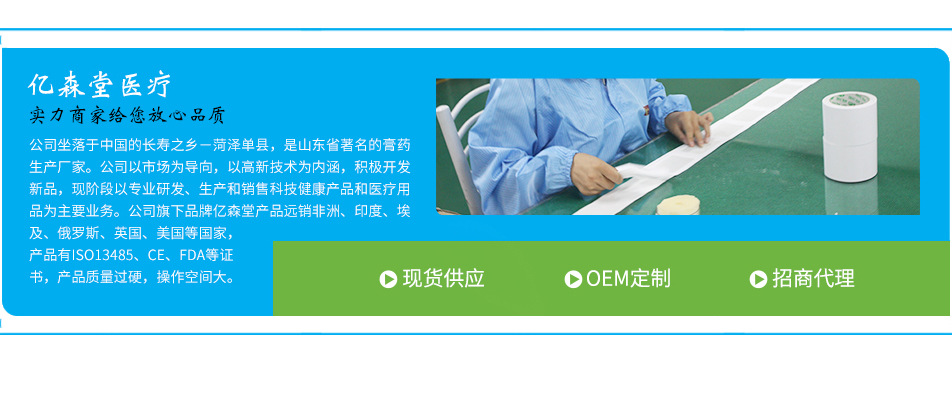 山東億森堂醫(yī)療器械有限公司是一家集科研開發(fā)、生產(chǎn)銷售為一體的高新技術(shù)企業(yè)。公司總注冊(cè)資金達(dá)500萬元。 公司坐落于中國的長壽之鄉(xiāng)-菏澤單縣,是山東省著名的膏藥生產(chǎn)廠家。公司以市場為導(dǎo)向,以高新技術(shù)為內(nèi)涵,積極開發(fā)新品,現(xiàn)階段以專業(yè)研發(fā)、生產(chǎn)和銷售科技健康產(chǎn)品和醫(yī)療用品為主要業(yè)務(wù),而下階段的目標(biāo)是成為一家以健康產(chǎn)業(yè)為主的上市公司,我們希望能為人類的健康事業(yè)做出巨大貢獻(xiàn)。 公司旗下品牌億森堂產(chǎn)品遠(yuǎn)銷非洲、印度、埃及、俄羅斯、英國、美國等國家,產(chǎn)品有ISO13485、CE、FDA等證書,產(chǎn)品質(zhì)量過硬,操作空間大。 目前公司主要生產(chǎn)遠(yuǎn)紅外貼治療貼、退熱貼、足貼、蒸汽眼罩、灸熱治療貼、遠(yuǎn)紅外磁療貼、冷療貼、穴位貼等計(jì)30多個(gè)品種。針對(duì)目前市場上同類產(chǎn)品較多,競爭也比較激烈的情況,該公司重點(diǎn)要求產(chǎn)品的功能、特點(diǎn)。產(chǎn)品有效是我們對(duì)患者最好的承諾。 現(xiàn)工廠面向全球直招代理、微商團(tuán)隊(duì),產(chǎn)品新穎,品質(zhì)優(yōu)良,利