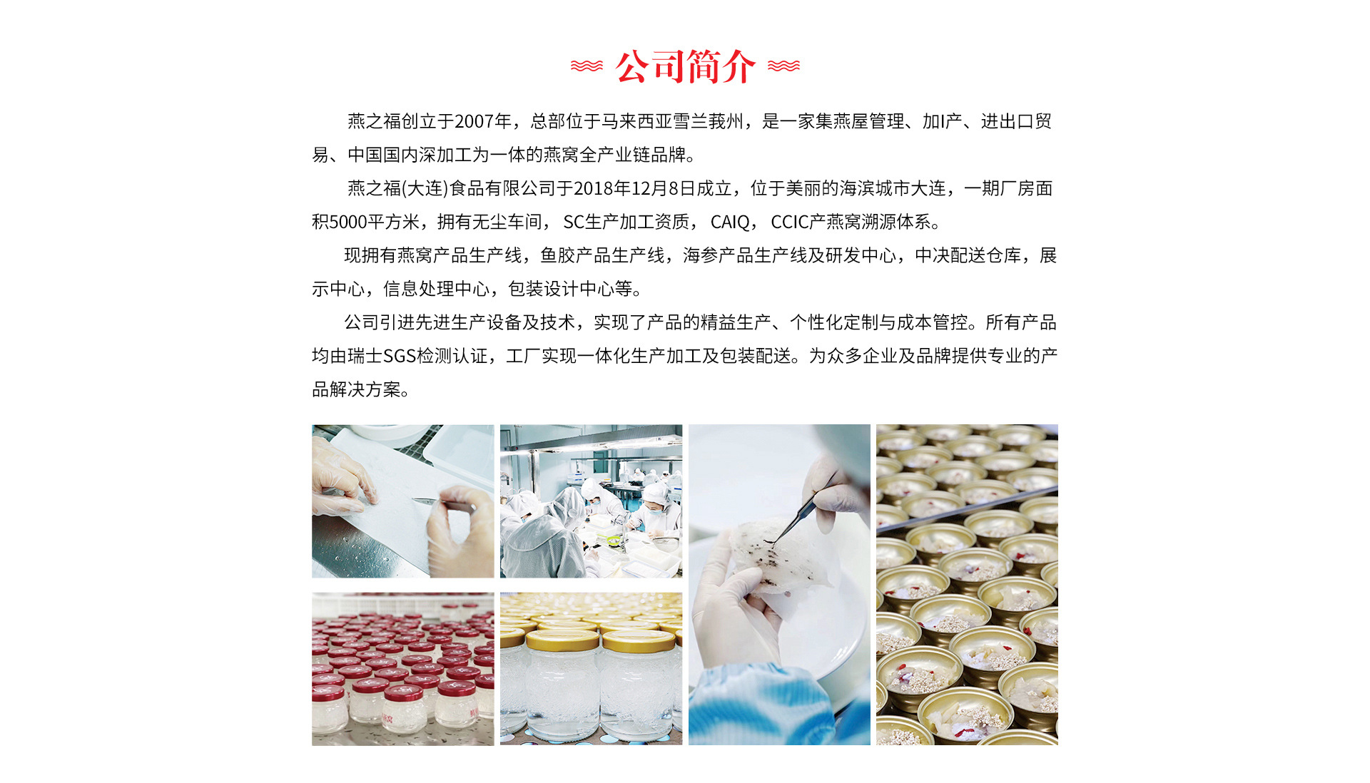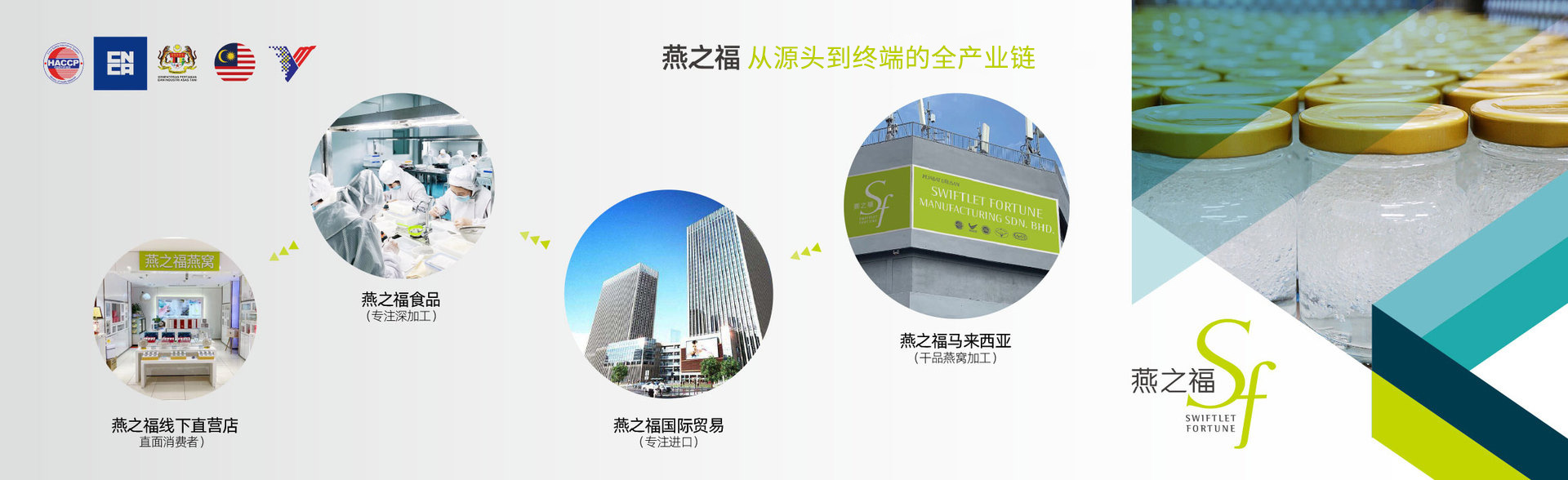燕之福創立于2007年,總部位于馬來西亞雪蘭莪州,是-家集燕屋管理、加工生產進出口貿 易、中國國內深加工為一體的燕窩全產業鏈品牌。 燕之福(大連)食品有限公司于2018年12月8日成立,位于美麗的海濱城市大連,一期廠房面 積5000平方米,擁有無塵車間,SC生產加工資質,CAIQ, CCIC產燕窩溯源體系。 現擁有燕窩產品生產線,魚膠產品生產線,海參產品生產線及研發中心,中決配送倉庫,展 示中心,信息處理中心,包裝設計中心等。 公司引進先進生產設備及技術,實現了產品的精益生產、個性化定制與成本管控。所有產品 均由瑞士SGS檢測認證,工廠實現一體化生產加工及包裝配送。為眾多企業及品牌提供專業的產 品解決方案。