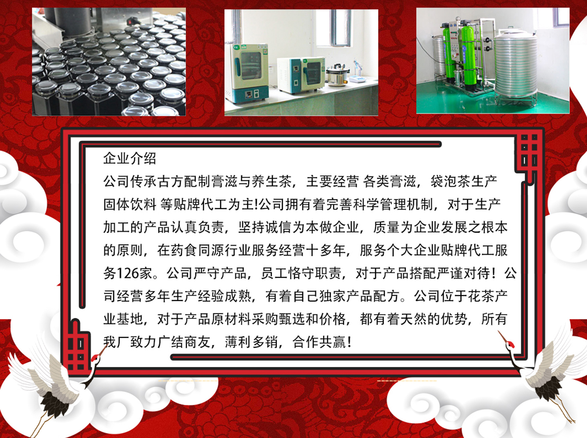 安徽太仁堂生物科技有限公司位于中國四大藥都之首--安徽亳州。盛產中藥材和花茶。為我司生產優質膏滋提供了充足的原材料。我司有優秀的研發團隊和強大的生產實力,可接大單急單,快速出貨。歡迎業界人士蒞臨指導洽談!