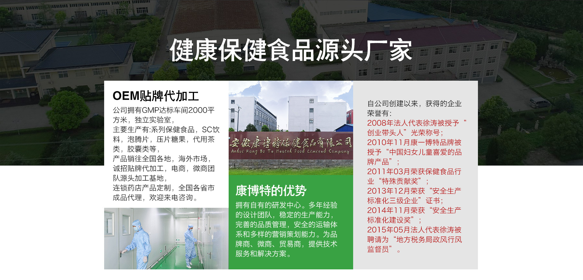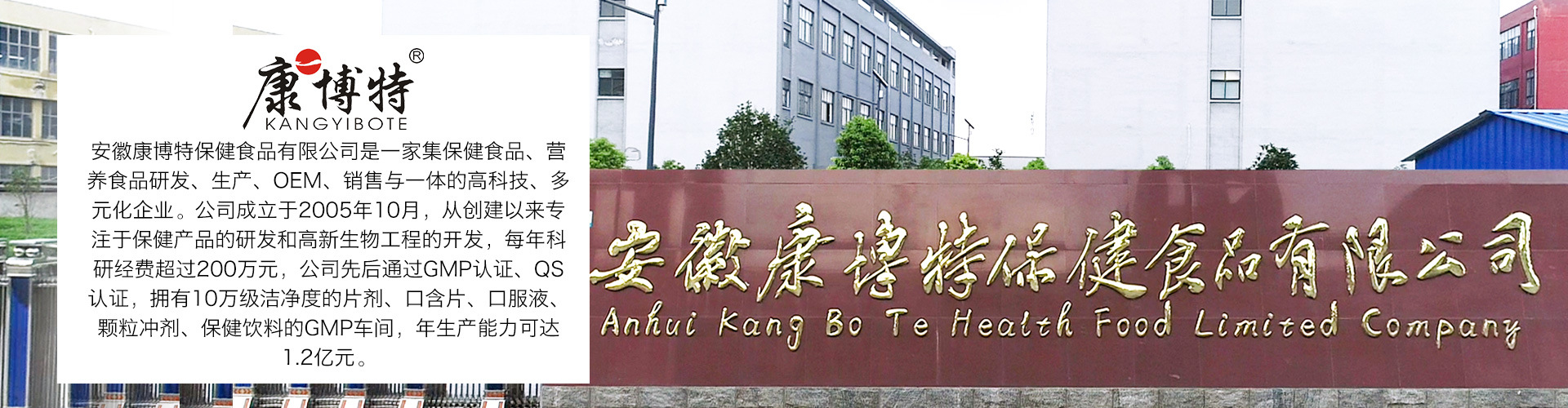 安徽康博特保健食品有限公司是一家集保健食品、營養食品研發、生產、OEM、銷售于一體的高新人才、高新技術、自動化、多元化企業。公司成立于2005年,每年投入科研經費200萬元以上,先后通過GMP認證、SC認證、ISO9001質量管理體系認證、國家高新技術培育企業認證、HACCP體系認證等等,擁有10萬級潔凈無塵車間,產品覆蓋:保健食品營養補充劑、孕婦乳母特殊膳食、嬰幼兒特殊膳食、運動營養特殊膳食、固體飲料、壓片糖果、軟膠囊、口服液等,人群覆蓋:嬰幼兒、兒童、青少年、成人、女士、孕婦、運動健美、中老年等,年生產能力達5.2億元。