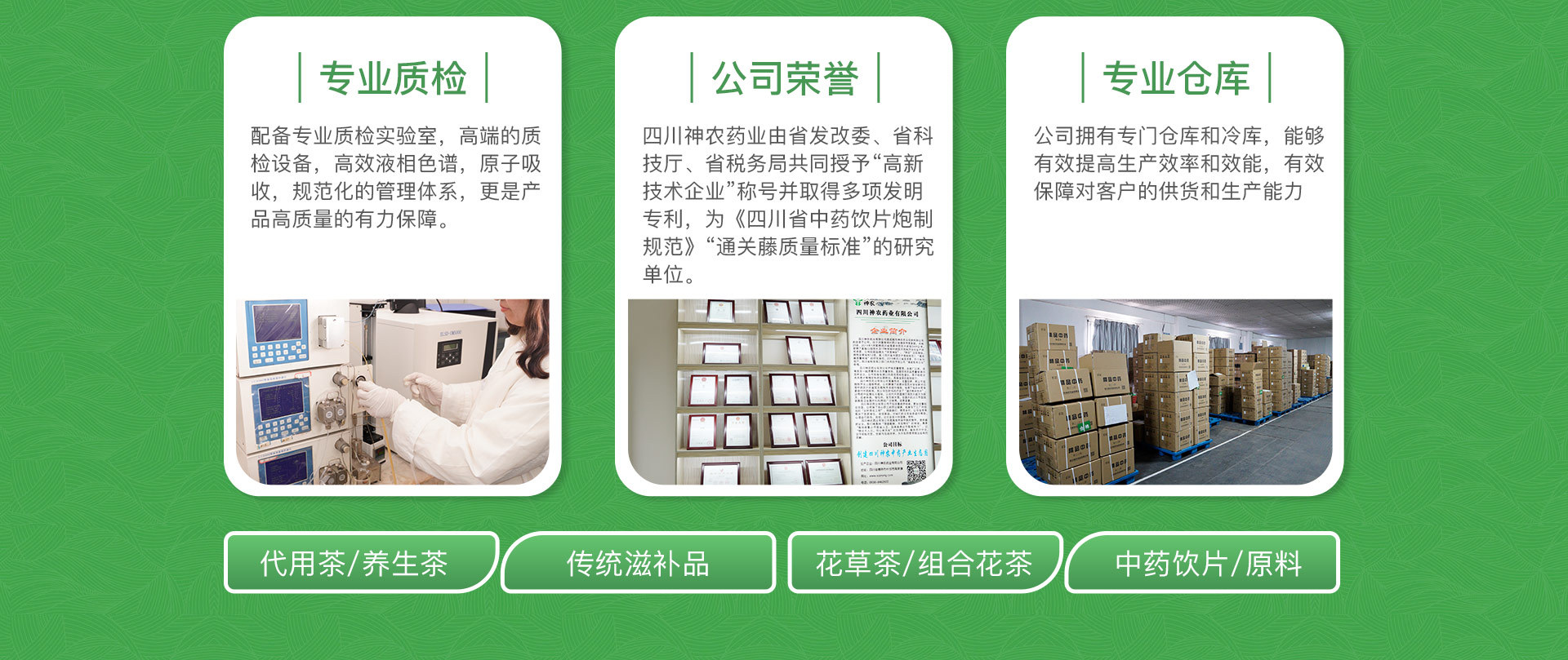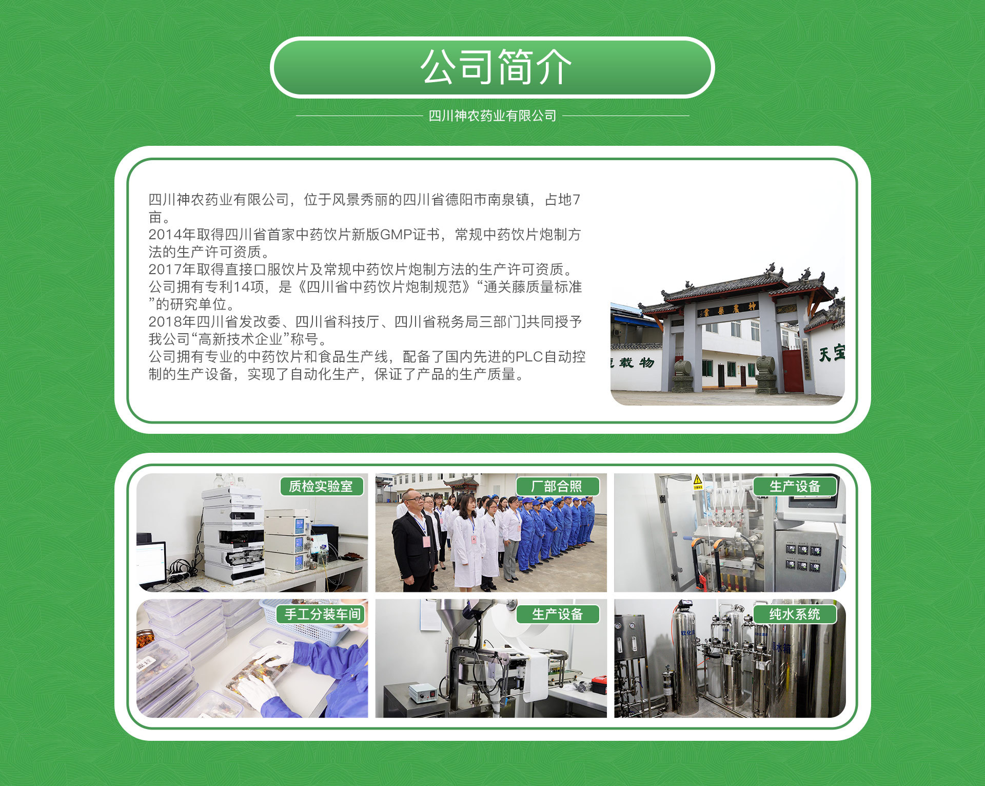 四川神農藥業有限公司位于四川省德陽市南泉鎮,占地25畝,集生產、科研為一體的科技型中藥飲片生產企業.主要從事養生茶、藥食同源、中藥飲片研發、生產、銷售.公司現有員工136人,其中5人具有執業藥師資格證,擁有本科、研究生學歷的食品及藥品相關專業15人.2014年取得四川省首家中藥飲片新版GMP證書,同時取得17種常規中藥飲片炮制方法的生產許可資質;2017年取得直接口服飲片及16種常規中藥飲片炮制方法的生產許可資質;2017年獲得安全生產標準化三級企業證書;2018年取得互聯網藥品服務信息資格證書;2018年四川省發改委、四川省科技廳、四川省稅務局三部門共同授予我公司“高新技術企業”稱號.公司不僅擁有“祥農”注冊商標,還擁有專利18項,是《四川省中藥飲片炮制規范》“通關藤質量標準”的研究單位. 公司是德陽市藥品質量管理示范企業,配有進口安捷倫高效液相色譜儀、原子吸收分光光度計等精密檢測儀