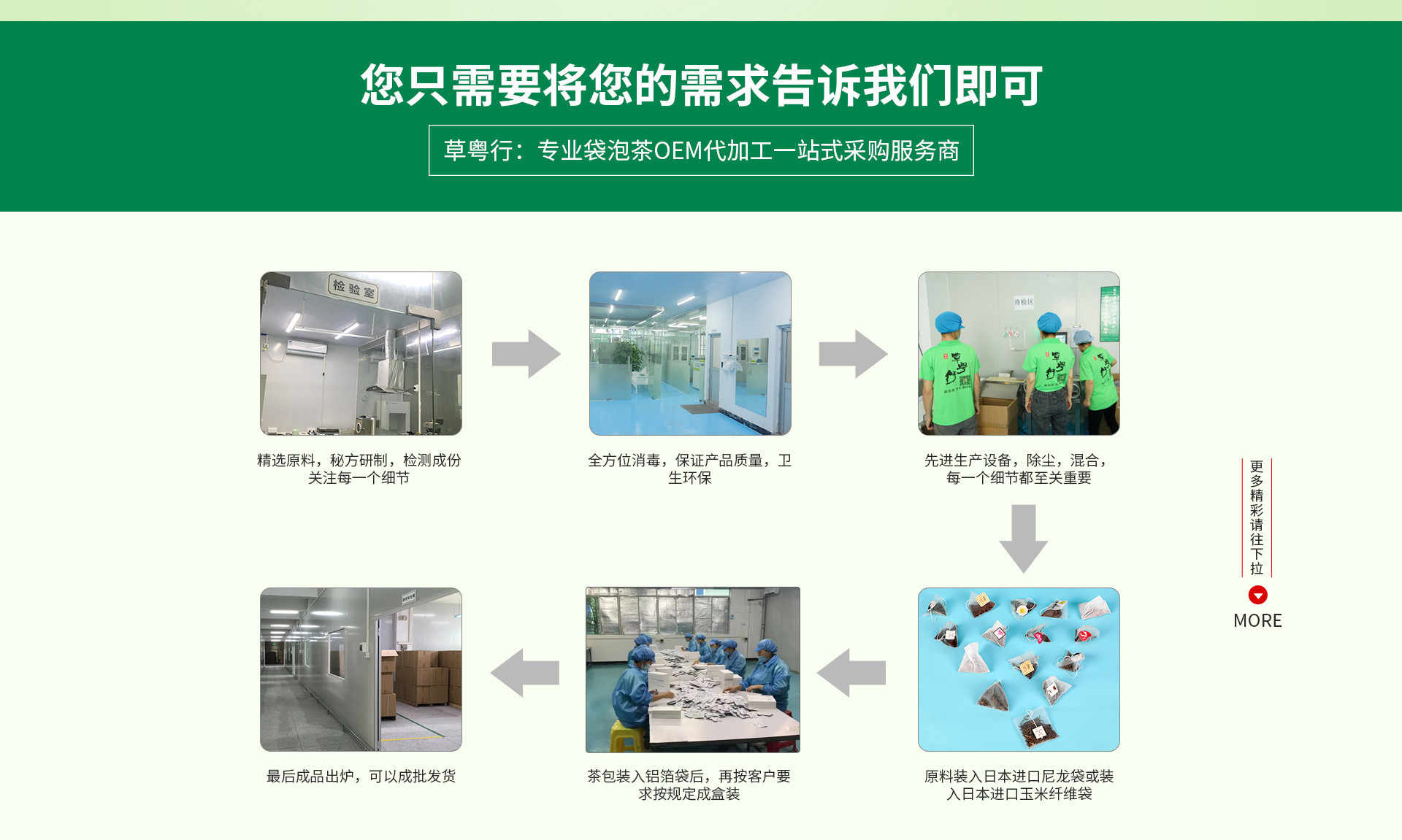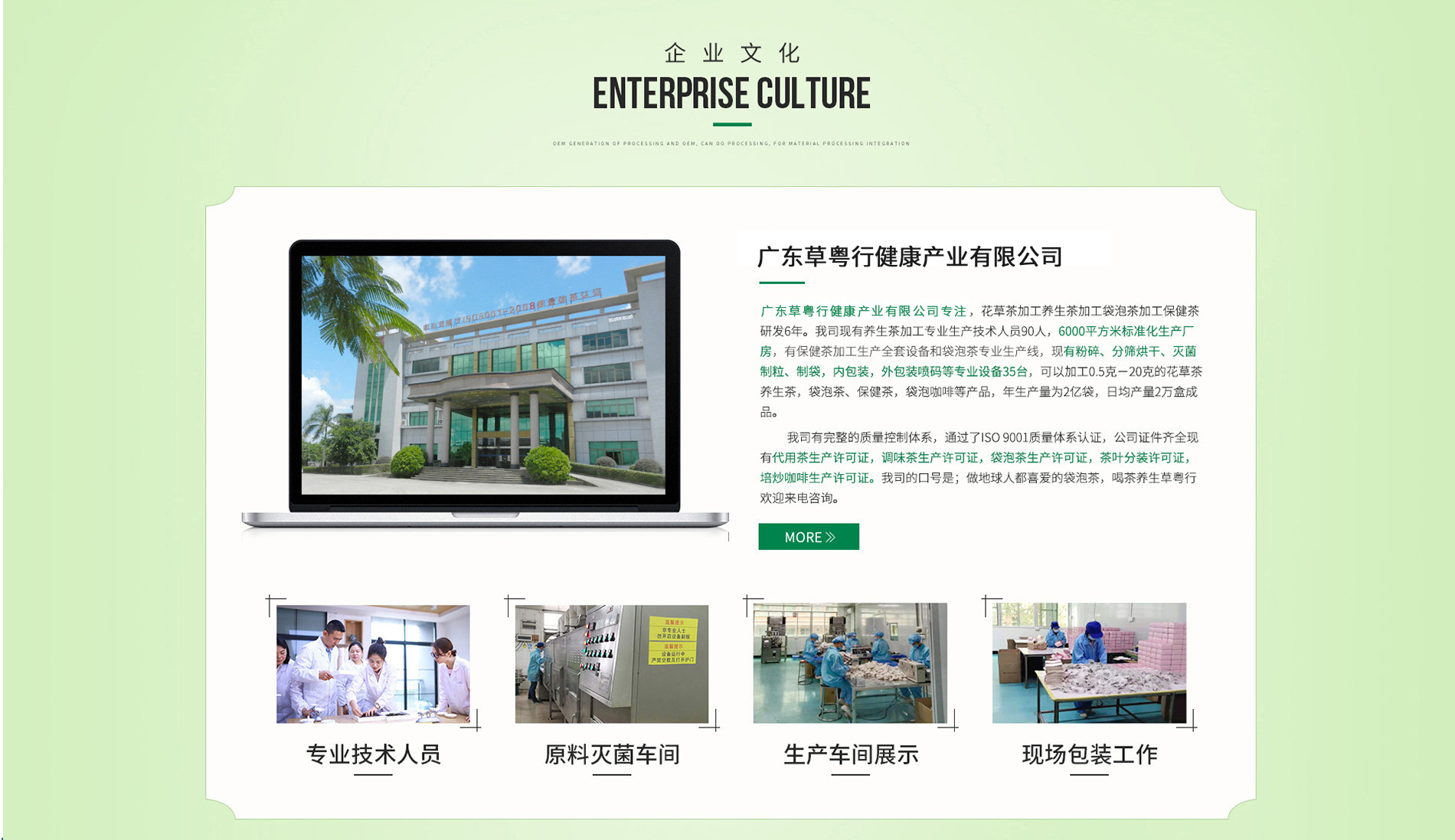 廣東草粵行健康產業有限公司(簡稱草粵行)經過多年的專注經營發展已成為一家集茶制品產品研發、包裝設計、生產、銷售于一體的創新型國家高新技術企業。通過多年不斷鉆研創新改進已取得多項茶制品相關實用新型專利,精制藥食同源袋泡茶和精制茶全工藝加工技術服務兩項產品也被認定為廣東省高新技術產品。擁有8000余平方米的SC認證標準化生產車間及設施齊全的檢驗室,通過HACCP質量體系認證制訂了一套完整、科學的質量管理體系來確保產品質量,具備茶葉分裝、袋泡茶、代用茶、調味茶(代用茶、袋泡茶、調味茶同時具備出口生產資質)和沖調類方便食品兩大類別生產許可,擁有一支100人左右具備多年茶制品及方便食品專業研發生產經驗的技術團隊,配備有2條茶制品及1條方便食品全工藝生產線,可以滿足客戶需要一體化訂制生產各種茶葉、袋泡茶、配方茶、水果茶、調味茶、方便食品,也可以來料加工、貼牌生產。