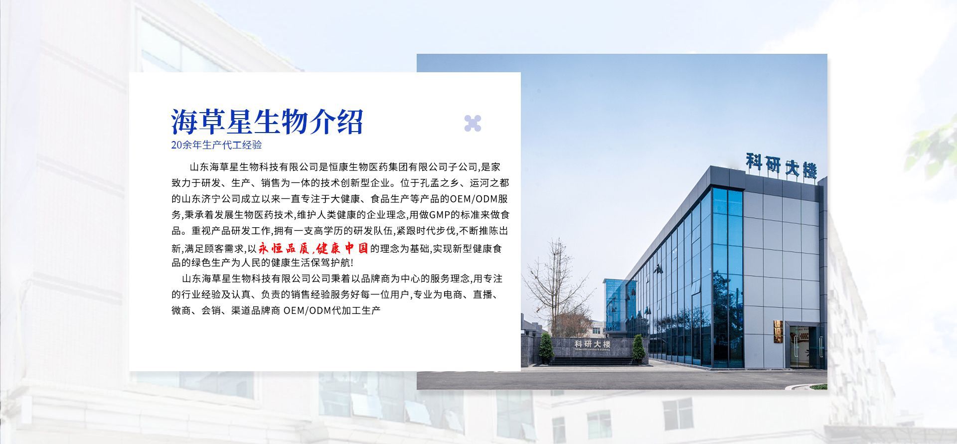 山東海草星生物科技有限公司是恒康集團(tuán)公司銷售子公司,坐落在儒家文化、運(yùn)河文化的重要發(fā)祥地之一的濟(jì)寧,是一家從事研發(fā)、生產(chǎn)、銷售為一體的健康科技有限公司。 我公司以經(jīng)營保健食品生產(chǎn)、食品生產(chǎn)、液飲生產(chǎn)、特醫(yī)特膳生產(chǎn)、保健品生產(chǎn)及化妝品生產(chǎn),包括潔面、水、乳、霜、膏面膜等GMP認(rèn)證及國食健字批準(zhǔn)文號(hào)、QS、國妝特字號(hào)等;生產(chǎn)劑型覆蓋了軟膠囊、片劑、粉劑、顆粒劑、液飲和代用茶劑等劑型,獲批了近20個(gè)保健食品,QS食品50多個(gè);工廠引進(jìn)進(jìn)口設(shè)備60余臺(tái),年產(chǎn)量可達(dá)1000萬噸以上。 公司推出海草星補(bǔ)鈣系列、補(bǔ)鋅系列、補(bǔ)血系列、維生素系列、泡騰片系列、海草星小分子膠原蛋白肽系列、咖啡系列、代餐奶昔系列、果蔬粉系列、顆粒沖劑、軟膠囊、等系列產(chǎn)品; 恒然堂生物有限公司,用生物技術(shù)智慧撼動(dòng)未來,用科學(xué)連接前沿,用創(chuàng)新連接世界。以發(fā)展生物技術(shù)、維護(hù)人類健康為理念,以先進(jìn)技術(shù)在生物技術(shù)行業(yè)的應(yīng)用為基礎(chǔ),