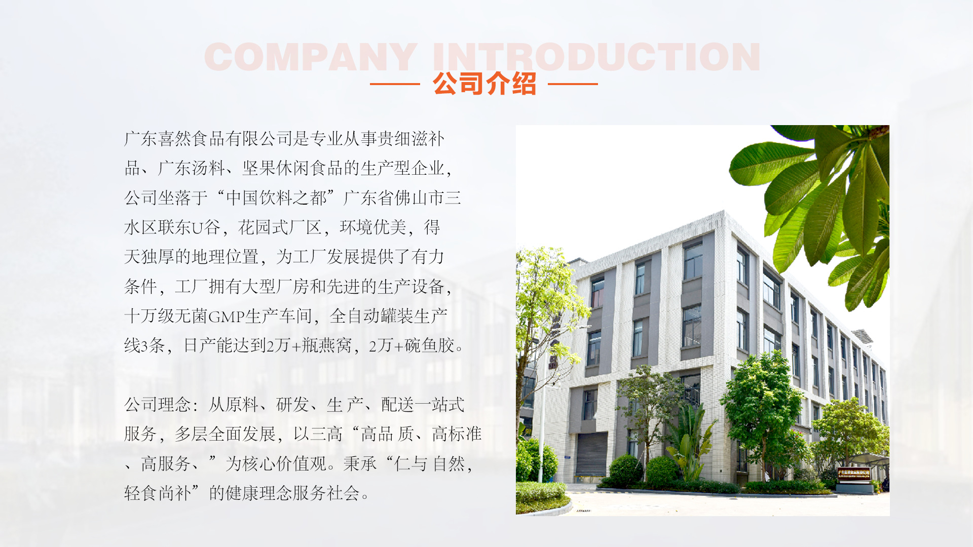 廣東喜然食品有限公司是專業型生產廠家,專注于OEM貼牌代工:即食燕窩、即食花膠等燕窩、花膠衍生制品。 公司擁有全自動罐裝生產線3條,日產能5萬瓶/碗,從原料采購、研發、生產、配送一站式服務多層全面發力。 以“高品質、高標準、高服務”為核心價值理念。秉承“仁與自然,輕食尚補”的健康理念服務社會