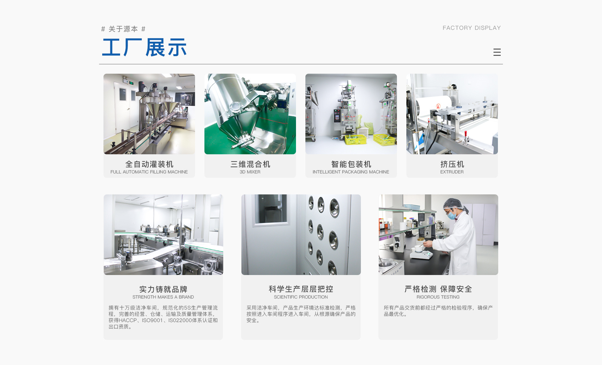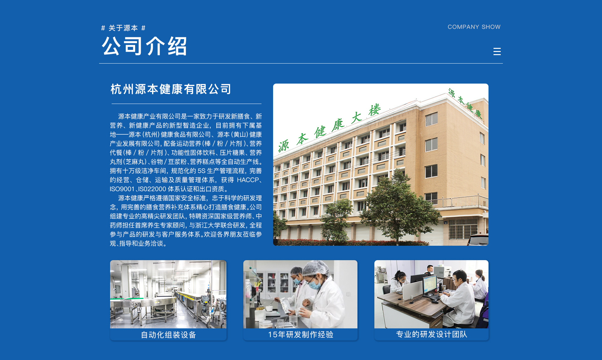 源本健康產業有限公司是一家致力于研發新膳食、新營養、新健康產品的新型企業,目前擁有的下屬基地——源本(杭州)健康食品有限公司、源本(黃山)健康產業發展有限公司,并擁有能量棒、運動營養代餐棒、功能性固體飲料等全自動生產線,同時擁有完善的經營、倉儲、運輸及質量管理體系,并嚴格遵守國家質量標準,采用十萬級凈化車間,科學化、規范化的5S生產管理流程。