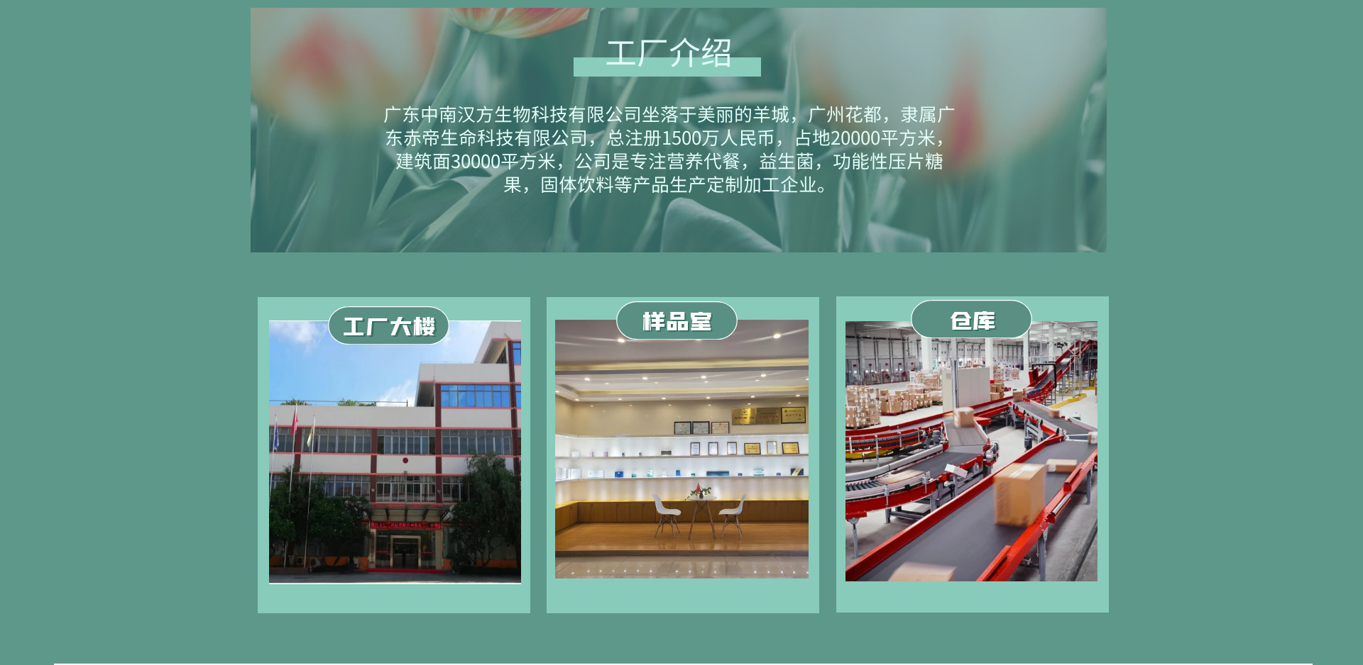 ?東中南漢??物科技有限公司坐落于美麗的?城,?州花都,隸屬于廣東赤帝生 命科技有限公司,總投資1500萬??幣,占地20000平??,建筑?30000平?? 廣東中南漢方生物科技有限公司是減肥、營養(yǎng)代餐、益生菌、功能性壓片糖果、固體飲料、酵素等產品專業(yè)生產加工的公司擁有完整、科學的質量管理體系。本公司擁有完善的實驗室和一流的科研力量,自有多條生產線,業(yè)務范圍有OEM加工;來料加工 來樣加工;ODM加工;提供加工定制及批發(fā)自有品牌產品