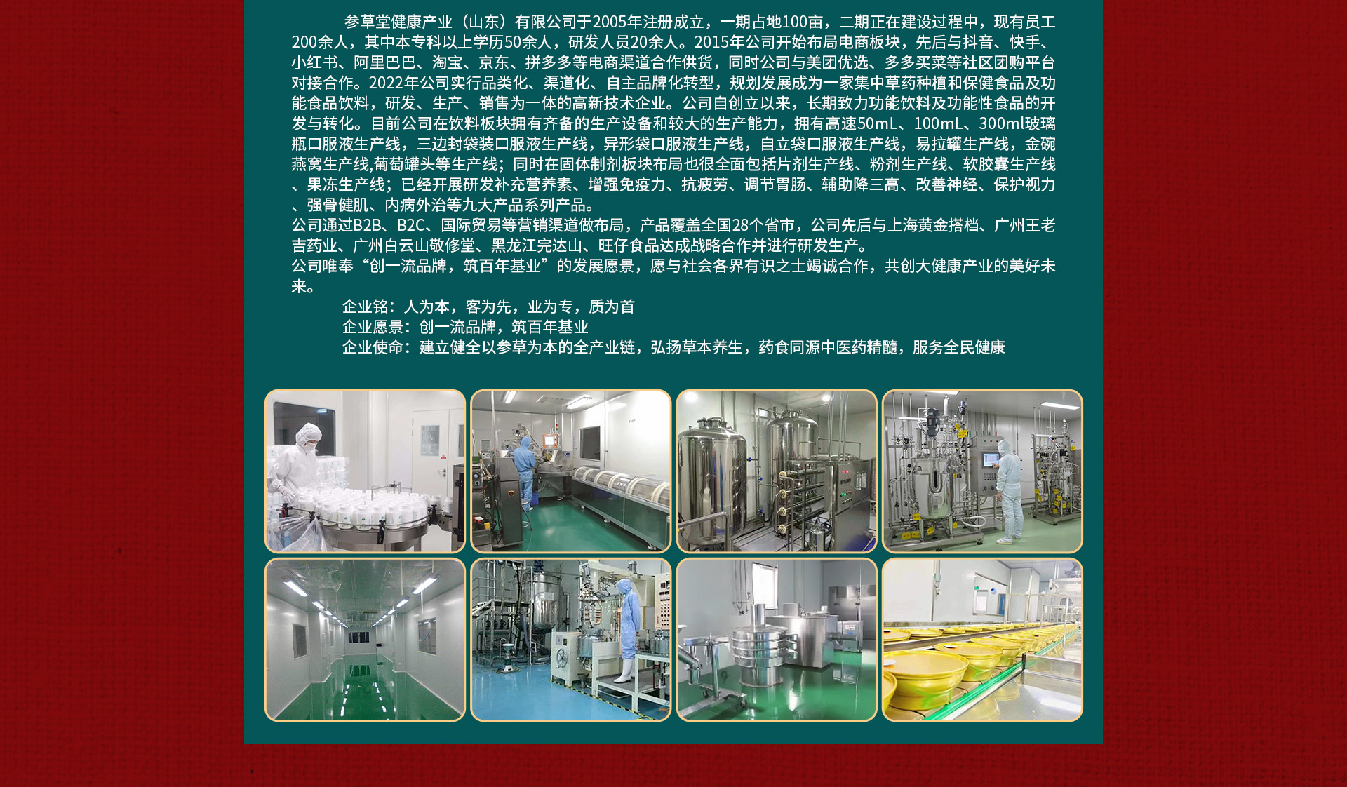 參草堂健康產業(山東)有限公司于2005年注冊成立,一期占地100畝,二期正在建設過程中,現有員工200余人,其中本專科以上學歷50余人,研發人員20余人。2015年公司開始布局電商板塊,先后與抖音、快手、小紅書、阿里巴巴、淘寶、京東、拼多多等電商渠道合作供貨,同時公司與美團優選、多多買菜等社區團購平臺對接合作。2022年公司實行品類化、渠道化、自主品牌化轉型,規劃發展成為一家集中草藥種植和保健食品及功能食品飲料,研發、生產、銷售為一體的高新技術企業。 公司自創立以來,長期致力功能飲料及功能性食品的開發與轉化。目前公司在飲料板塊擁有齊備的生產設備和較大的生產能力,擁有高速50mL、100mL、300ml玻璃瓶口服液生產線,三邊封袋裝口服液生產線,異形袋口服液生產線,自立袋口服液生產線,易拉罐生產線,金碗燕窩生產線,罐頭等生產線;同時在固體制劑也很全面包括片劑生產線、粉劑生產線、軟膠囊生產線
