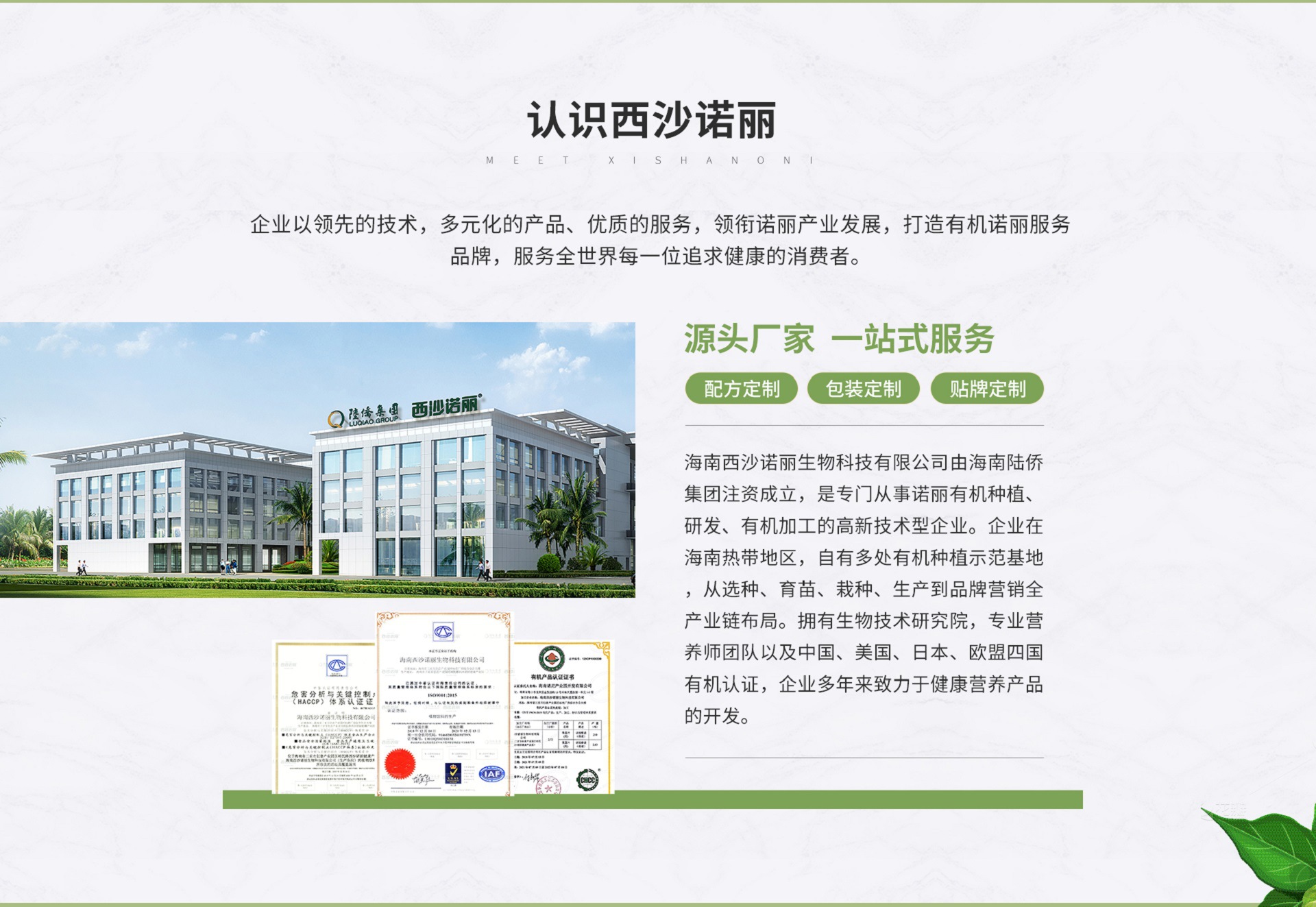 海南西沙諾麗生物有限公司由海南陸僑集團(tuán)注資成立,是專門從事諾麗有機(jī)種植、研發(fā)、有機(jī)加工的高新技術(shù)型企業(yè)。企業(yè)在海南熱帶地區(qū),自有多處有機(jī)種植示范基地,從選種、育苗、栽種、生產(chǎn)到品牌營(yíng)銷全產(chǎn)業(yè)鏈布局。擁有生物技術(shù)研究院、專業(yè)營(yíng)養(yǎng)師團(tuán)隊(duì)以及中國(guó)、美國(guó)、日本、歐盟四國(guó)有機(jī)認(rèn)證,企業(yè)多年來致力于健康營(yíng)養(yǎng)產(chǎn)品的開發(fā)。海南西沙諾麗生物科技有限公司的誠(chéng)信、實(shí)力和產(chǎn)品質(zhì)量獲得業(yè)界的認(rèn)可。歡迎各界朋友蒞臨參觀、指導(dǎo)和業(yè)務(wù)洽談。