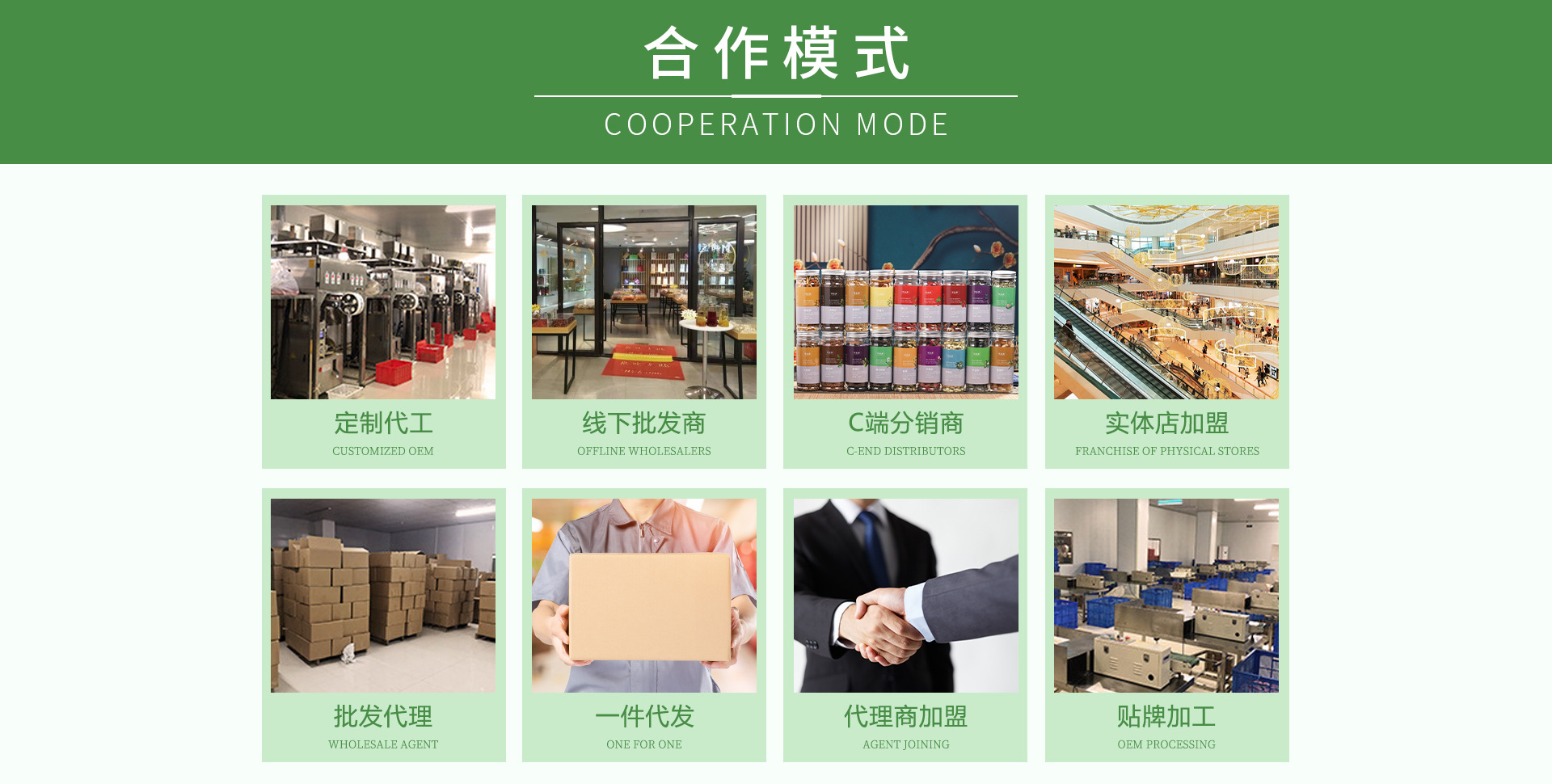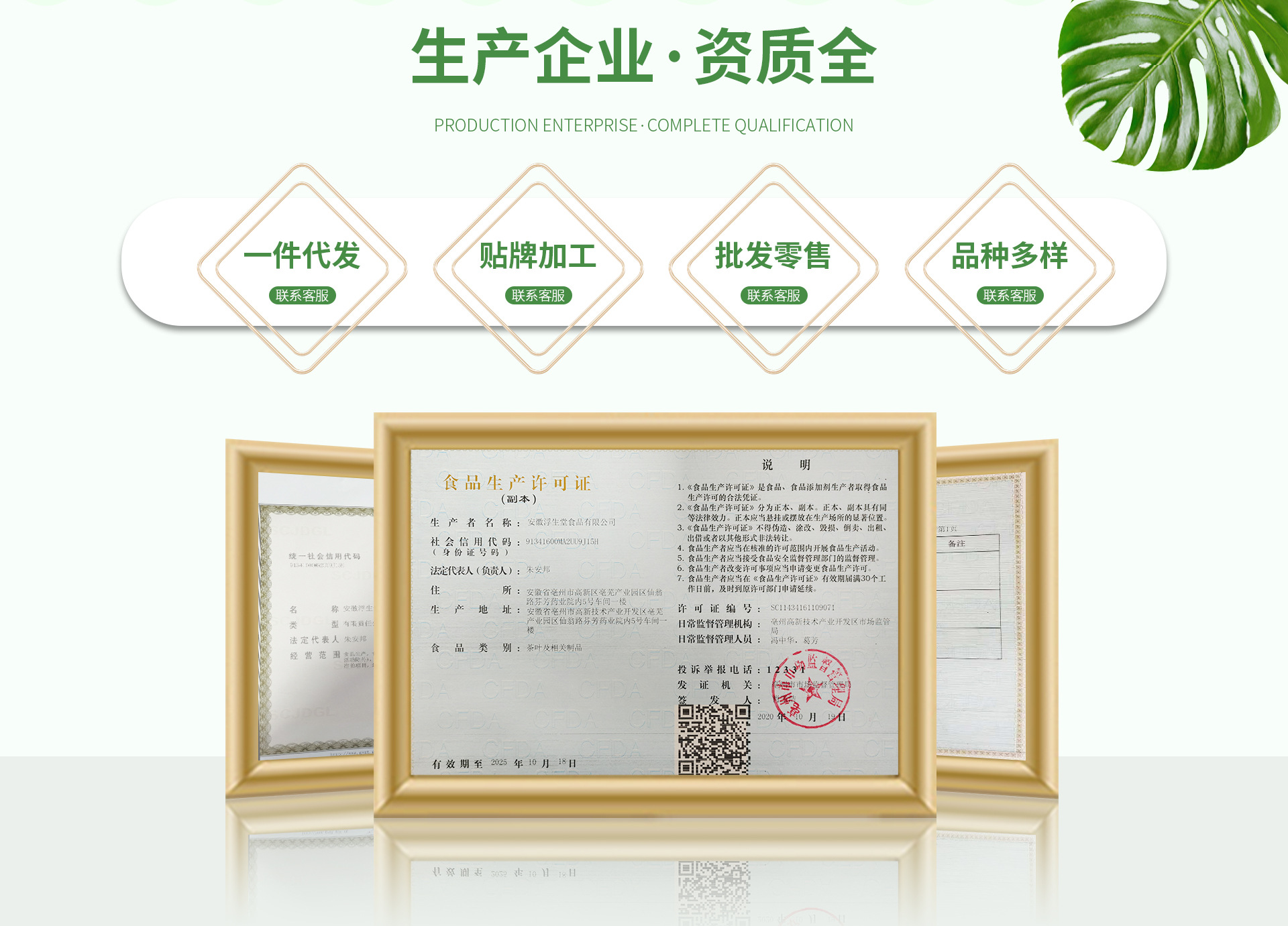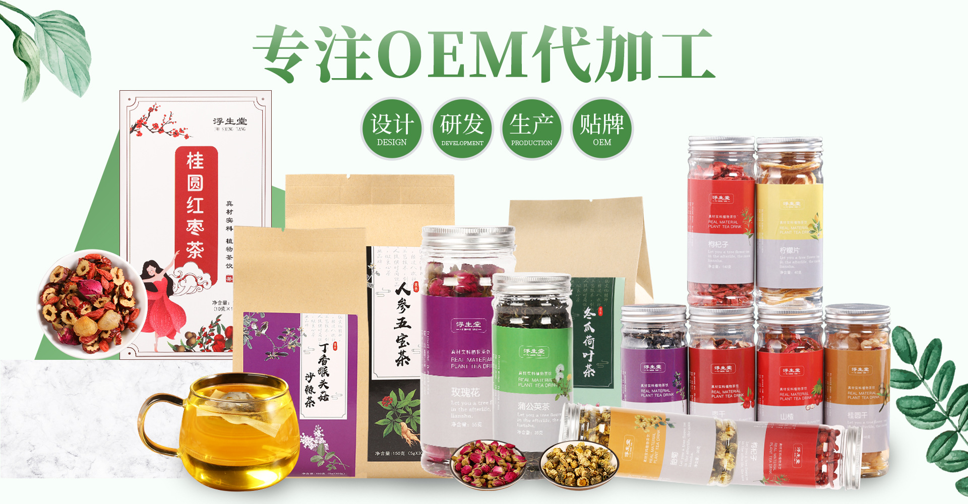 安徽浮生堂食品有限公司 主營(yíng)產(chǎn)品:各種袋泡茶產(chǎn)品(如:冬瓜荷葉茶、紅豆薏米茶、桑葉玉米須茶、三清茶等)、組合茶(如:桂圓紅棗茶、人參五寶茶、羅漢果胖大海菊花茶、等)、單品茶(如:枸杞子、黑枸杞、桂圓干、棗干、胎菊、玫瑰花等)等各種花茶的OEM貼牌代工、來(lái)料代工、可按客戶要求包裝定制、產(chǎn)品配料定制加工生產(chǎn)。(注:本公司資質(zhì)齊全、質(zhì)優(yōu)價(jià)低) 本公司占地面積兩千余平,擁有10條袋泡茶和5條組合茶生產(chǎn)線,日出貨量達(dá)10萬(wàn)袋/盒,保障急速出貨,大限度的為你節(jié)約產(chǎn)品等待時(shí)間,提高產(chǎn)品的訂單轉(zhuǎn)化量。 聯(lián)系方式 公司座機(jī):0558-5016666 朱經(jīng)理:18256789690 24小時(shí)在線,歡迎隨時(shí)咨詢聯(lián)系。