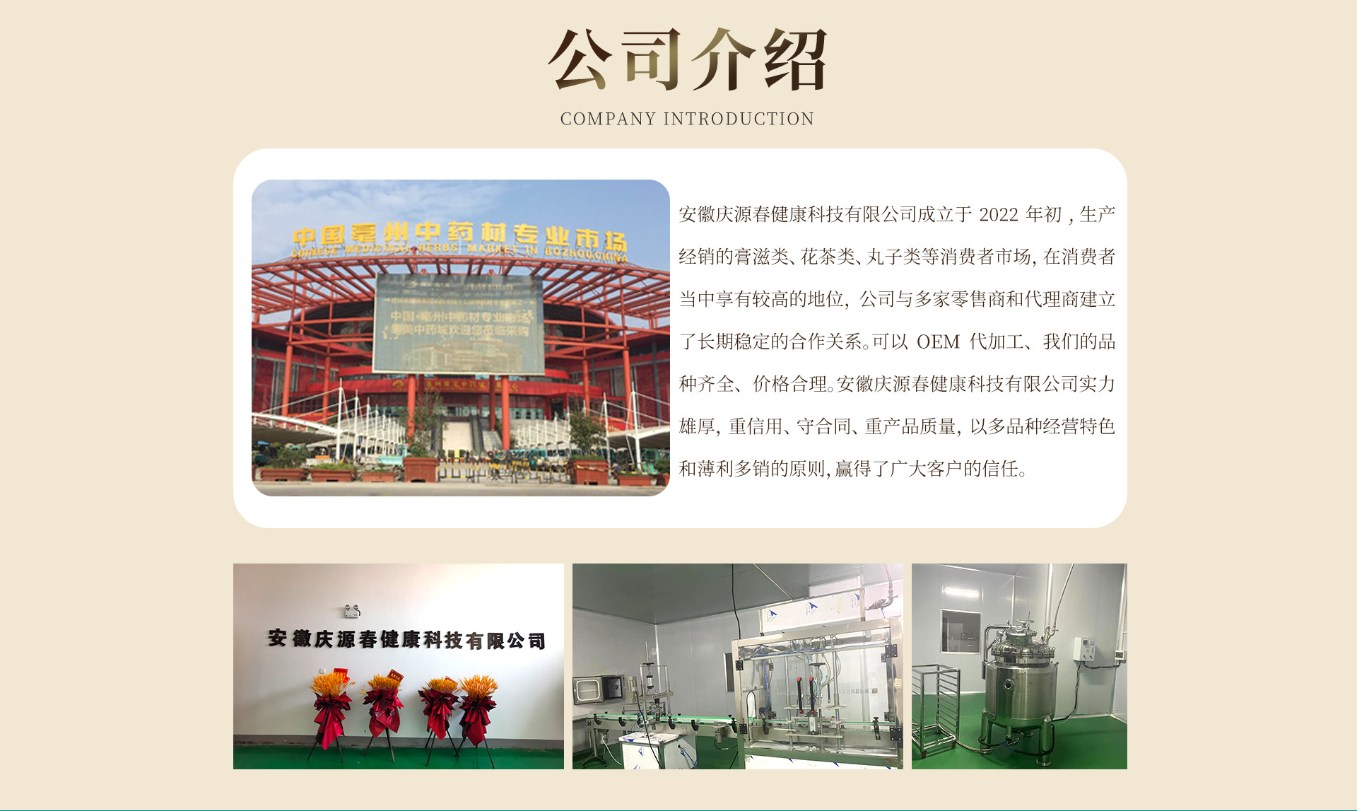 安徽慶源春健康科技有限公司占地一千多平,現有植物飲料,膏滋,糕點,花茶,養生丸等生產線,歡迎各位實地考察洽談合作!
