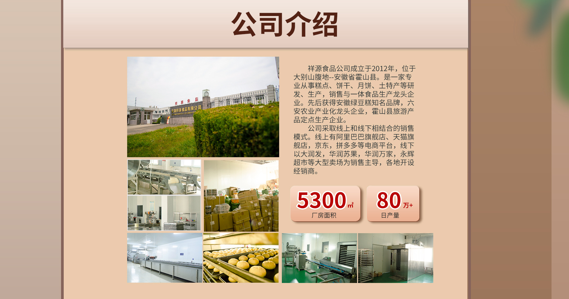 徽祥源食品有限公司成立于2016年,位于環(huán)境優(yōu)美,物產(chǎn)豐富的大別山腹地--安徽省霍山縣。是一家專業(yè)從事糕點(diǎn)、餅干、月餅、土特產(chǎn)等研發(fā)、生產(chǎn),銷售與一體食品生產(chǎn)龍頭企業(yè)。先后獲得安徽綠豆糕知名品牌,六安農(nóng)業(yè)產(chǎn)業(yè)化龍頭企業(yè),霍山縣旅游產(chǎn)品定點(diǎn)生產(chǎn)企業(yè)。 公司采取線上和線下相結(jié)合的銷售模式。線上有阿里巴巴旗艦店、天貓旗艦店,京東,拼多多等電商平臺,線下以大潤發(fā),華潤蘇果,華潤萬家,永輝超市等大型賣場為銷售主導(dǎo),全國各地開設(shè)優(yōu)秀經(jīng)銷商。 公司以產(chǎn)品為基礎(chǔ),以市場為導(dǎo)向,以具有競爭力的開發(fā)和生產(chǎn)能力為后盾,重質(zhì)量,守信譽(yù),重專業(yè),精研發(fā),以做事業(yè)信心和決心為廣大客戶提供優(yōu)質(zhì)的產(chǎn)品和服務(wù)及品牌創(chuàng)立。