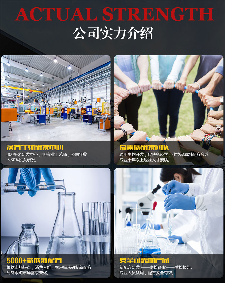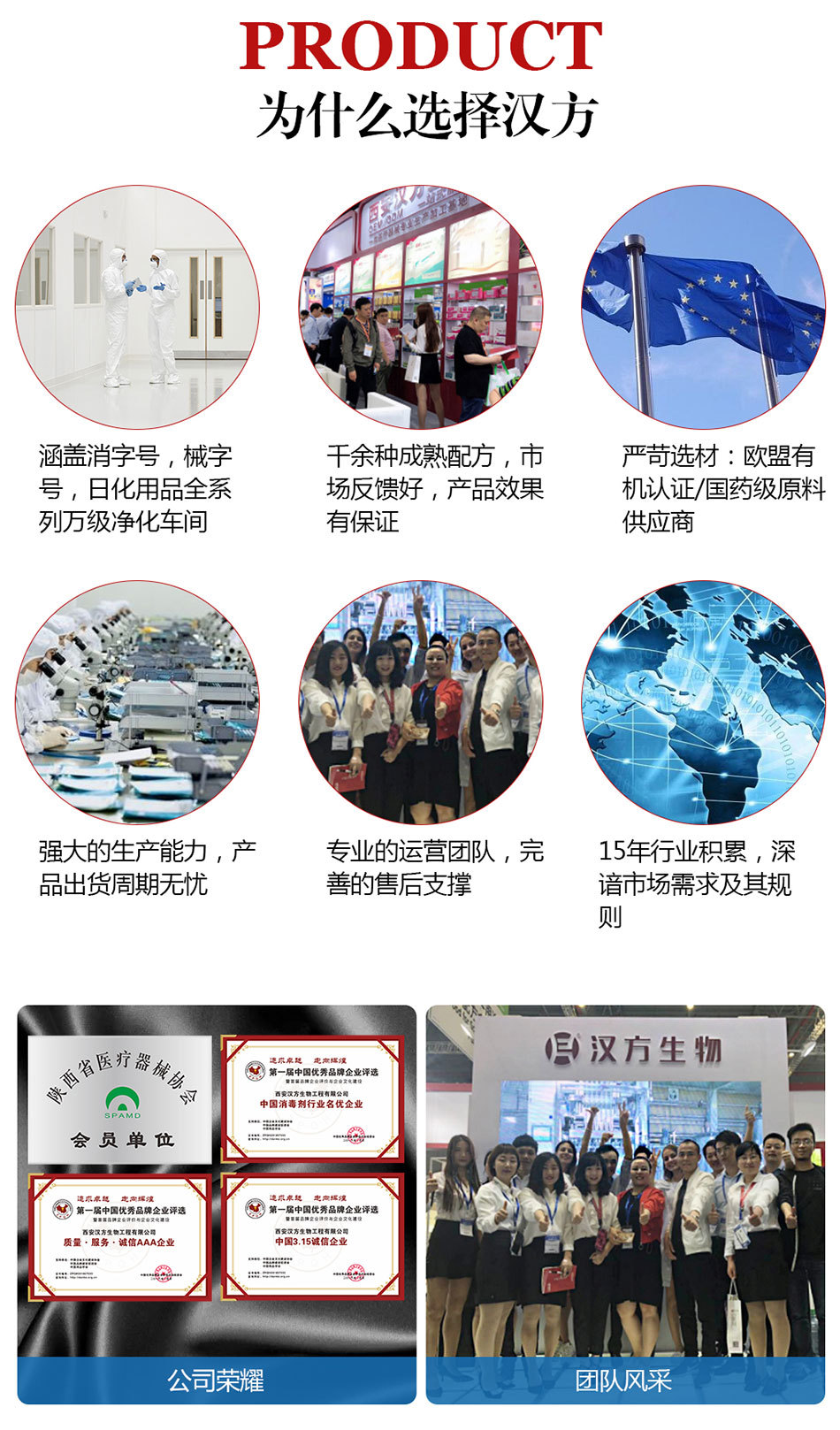 西安漢方生物工程有限公司,是一家集研發、生產、銷售、策劃為一身的多元化新型技術型企業,公司旗下六大部門,生產事業部、技術研發部、品牌運營部、電商運營部,實體店運營部,客戶服務部;公司本著視質量為產品生命的宗旨,為廣大經銷商提供全方位研、產、銷的一站式綜合服務。 漢方生物自成立以來,產品受到眾多代理商和消費者的好評,企業因此而獲得了長足的發展,2016年公司投入2000萬,新建兩條10萬級凈化標準生產線,占地面積約5000平方米。 “漢方生物”將會是您最佳的合作伙伴,我們真誠的歡迎廣大同仁前來實地考察洽談!
