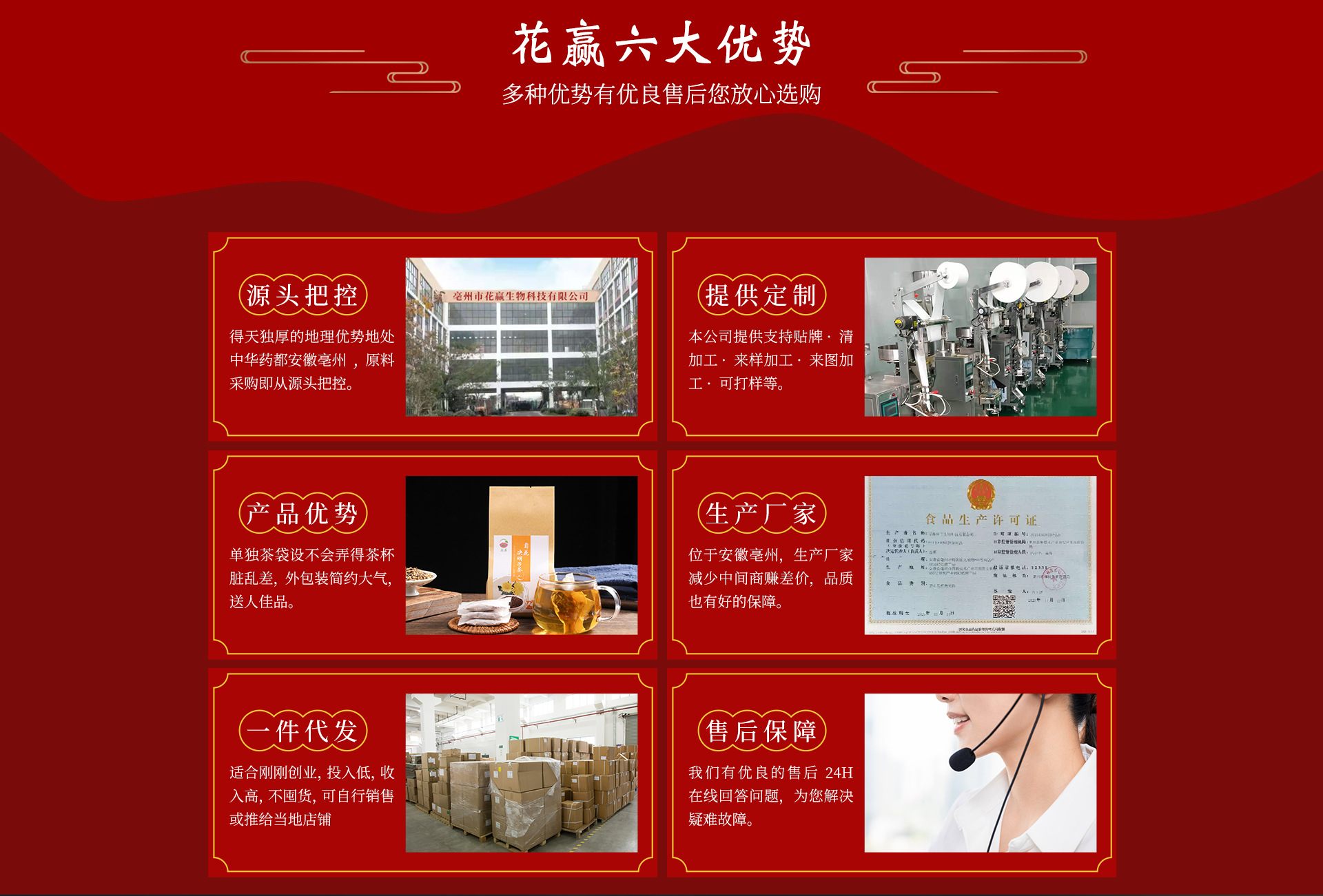 亳州市花贏生物科技有限公司是一家生產加工為一體的生產型企業,公司位于四大藥都之首安徽-亳州,廠區環境優美、物流便捷,標準化SC生產車間,完善的質量管理體系,公司現有員工86人,其中研發人員3人,檢驗員3人,化驗員2人,公司主營:代用茶、調味茶、組合花茶等,秉承:誠信經營、質量第一的原則取得廣大客戶的信賴與支持,亳州市花贏生物科技有限公司歡迎新老客戶前來洽談與指導。