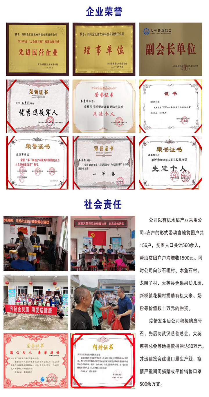四川金匯源農業科技有限責任公司是一家以有機水稻種植及乳制品、特醫食品研發、生產的生態型高科技企業,企業現已通過ISO9001國際質量管理體系認證、并榮獲16項國家專利,已在新四版掛牌上市,證券代碼:814101,證券名稱:金匯源。公司以GMP標準,高規格、高質量打造潔凈生產車間及符合環境要求的生產、檢驗中心;以“關愛大眾健康,奉獻優質產品”為使命,不斷發展創新做一個負責任的、讓消費者信賴的、受社會尊敬的綜合服務型企業。