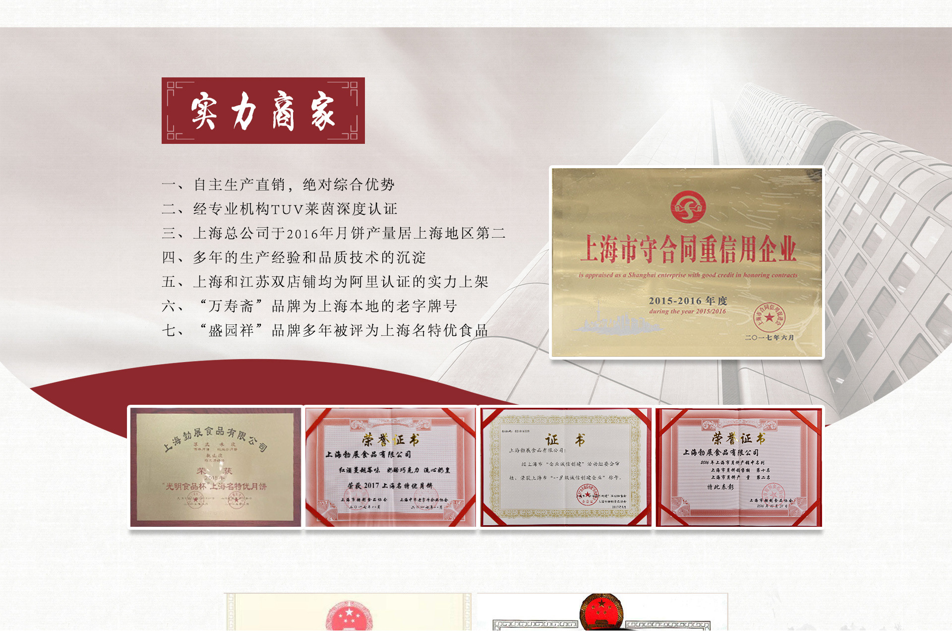 江蘇勃展食品有限公司。專業從事生產傳統食品的優秀企業,主要產品是中秋節月餅,端午節粽子,青團,八寶飯,重陽糕,糖年糕;并在全國各大城市擁有多個銷售分部,經銷商遍布全國。企業在上海有龍頭生產工廠,在江蘇宿遷建有大型生產基地,以生產高檔曲奇,冷凍手抓餅,蔥油餅,春卷皮為主要生產。蘇州工廠配有一體化渠道爐,冷卻塔,更是引進國外的先進設備和技術,并憑借持續不斷的研發創新能力,嚴格的生產管理、層層的品質管制,生產出口味一流,品質過硬的優質產品,專業生產月餅,甜點、大福團子、休閑點心、伴手禮等一系列優質產品。公司擁有老字號“萬壽齋”,全國品牌“盛園祥”,上海本土品牌“鑫春花”,企業通過HACCP國際認證。公司致力于打造成國內傳統食品生產基地, “為客戶提供安全、健康、滿意產品”為宗旨。