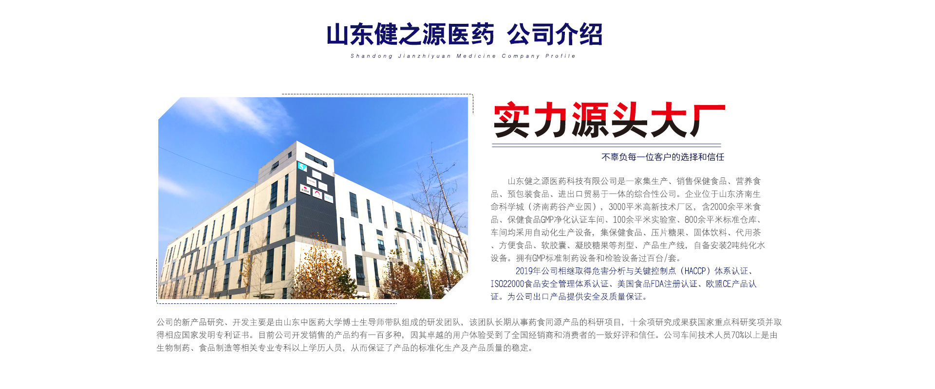 山東健之源醫藥科技有限公司專業承接壓片糖果、凝膠糖果(軟糖、軟膠囊)、固體飲料(粉劑、顆粒)、代用茶、方便食品、保健食品等各劑型的OEM代加工業務。 先后取得保健食品GMP認證、ISO22000認證、HACCP認證、歐盟CE產品認證、美國FDA認證。 先后榮獲《山東省營養保健協會會員單位》、《全國重合同守信用企業》、巜質量信得過企業》、《中國3.15誠信企業》、《全國質量、服務、信譽AAA級企業》; 實力廠家,專業貼牌 信譽+專業+實力 包裝設計,產品打樣,標準倉儲 ,物流運輸。商標注冊 ,無所不及! 只要您想要的我們都能做!