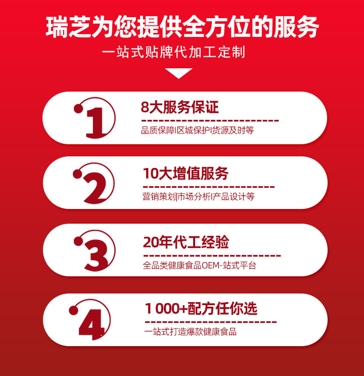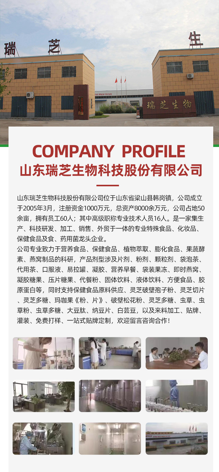 公司專業致力于營養食品、保健食品、植物萃取、膨化食品、果蔬酵素、燕窩制品的科研,產品劑型涉及片劑、粉劑、顆粒劑、袋泡茶、代用茶、口服液、易拉罐、凝膠、營養早餐、袋裝果凍、即時燕窩、凝膠糖果、壓片糖果、代餐粉、固體飲料、液體飲料、方便食品、膠原蛋白等,提供口服液代加工、超微粉碎代加工、固體飲料代加工、袋泡茶代加工、靈芝破壁孢子粉代加工、肽產品代加工、化妝品系列代加工、片劑代加工、膠囊代加工、中藥提取代加工等,同時支持保健食品原料供應、靈芝破壁孢子粉、靈芝切片、靈芝多糖、瑪咖果《粉、片》、破壁松花粉、靈芝多糖、蟲草、蟲草粉、蟲草多糖、大豆肽、納豆片、白蕓豆,以及來料加工、貼牌、灌裝、免費打樣、一站式貼牌定制,歡迎留言咨詢合作!