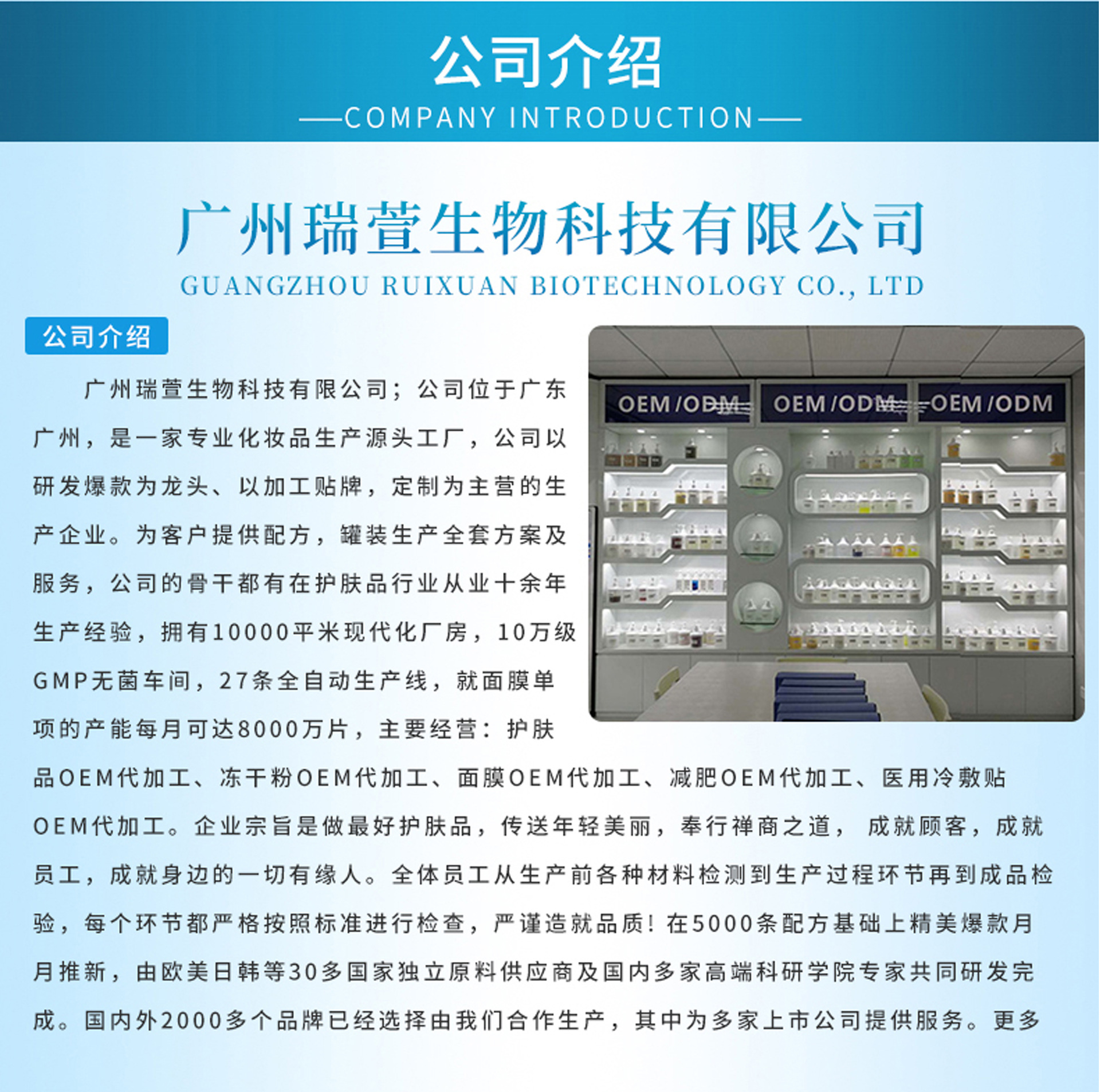 廣州瑞萱生物科技有限公司成立于2003年,是一家集科研、生產、銷售、OEM/ODM/OBM于一體的化妝品原料貿易代加工企業。經過多年的發展,瑞萱生物已成為中國美容養生產品原料行業的領軍企業。發展至今,瑞萱旗下已有五個自主品牌,全國3000多家合作商,提供原料批發或代加工服務。 工廠簡介:瑞萱的化妝品工廠是標準的化妝品生產基地,占地幾千平方,生產線可制做所有的專業線及日化線產品,國際GMP標準,按6S管理原則,OEC工作法,工廠獲得國家許可并有合格證件。工廠有專門的原料儲存區、專業實驗室、產品乳化區、半成品靜置區、灌裝包裝區、收發貨庫房。專業配備國內先進的全不銹鋼XY-A型真空乳化設備以及XY-C型攪拌設備,采用世界先進的生物學技術資源以及進口天然原料,由專業的技術工程師執行嚴格的工藝參數和工藝技術的控制,在品質工程師層層質量把關下,生產出高品質的化妝品。