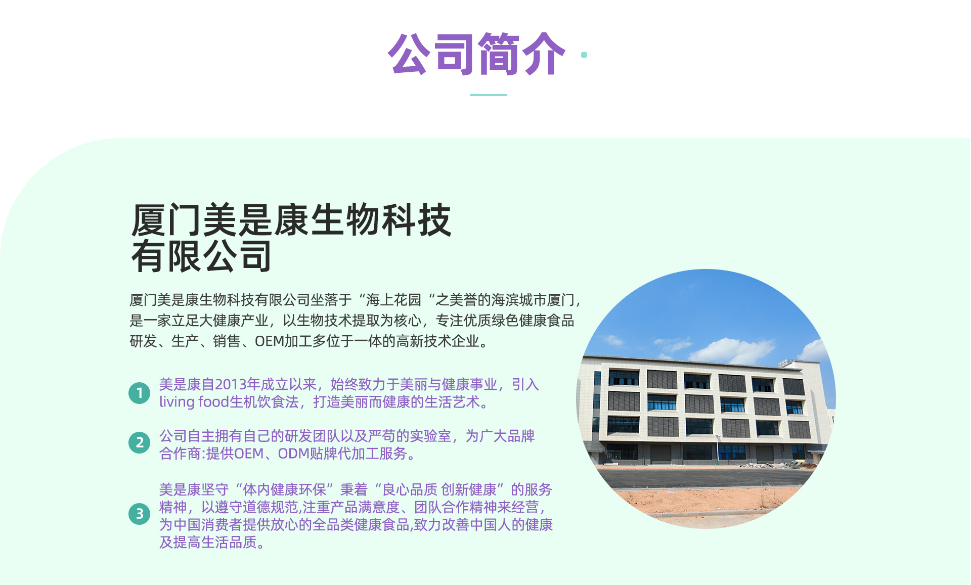 廈門美是康生物科技有限公司坐落于“海上花園”之美譽的海濱城市廈門,是一家立足大健康產業,以生物技術提取為核心,專注綠色健康食品研發、生產、銷售、OEM加工多位于一體的高新技術企業。承接各種oem代加工業務,為客戶提供專業的貼牌定制。