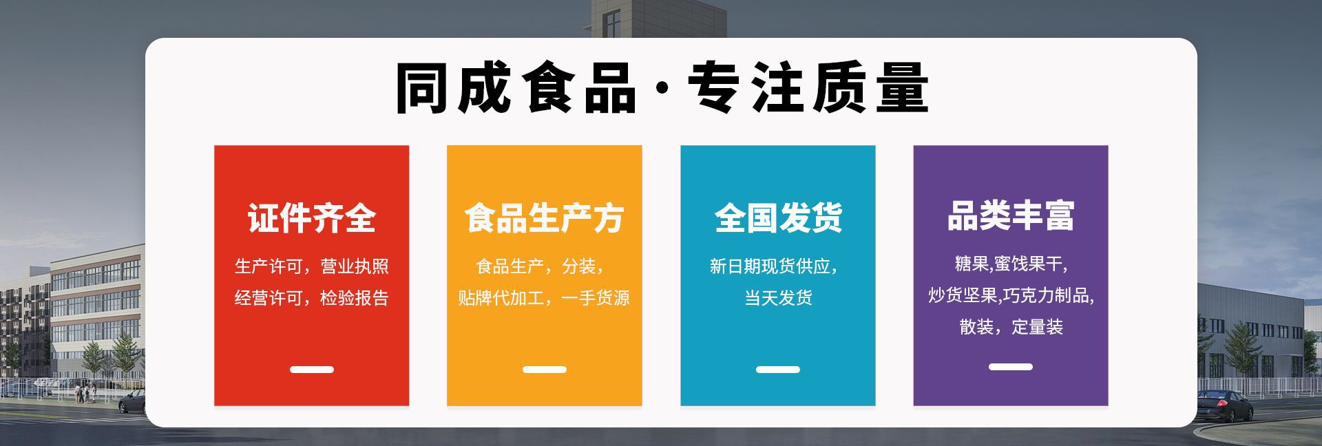 汕頭市同成食品有限公司是糖果、蜜餞、干果、堅果等產(chǎn)品專業(yè)生產(chǎn)加工的公司,擁有完整、科學(xué)的質(zhì)量管理體系。汕頭市同成食品有限公司的誠信、實力和產(chǎn)品質(zhì)量獲得業(yè)界的認(rèn)可。歡迎各界朋友蒞臨參觀、指導(dǎo)和業(yè)務(wù)洽談。