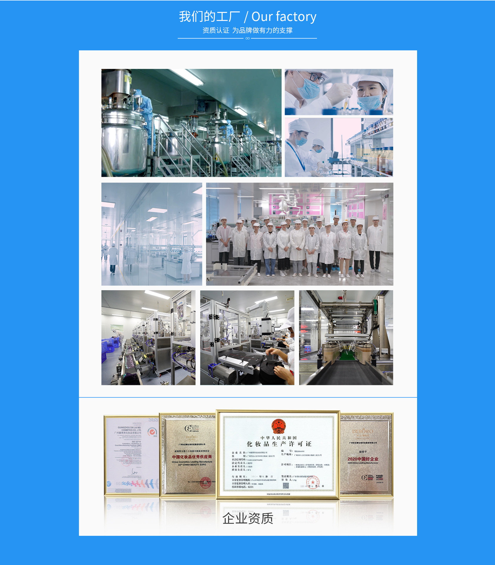 廣州黛萊美化妝品有限公司成立于2004年,是一家集化妝品原料研制、配方開發和加工生產及配套性服務于一體的專業OEM代加工企業,坐落于廣州市。公司研發中心1700平米,研發人員42名;工廠建筑面積3.5萬平米,制造車間面積1萬平米,產能覆蓋日化生產制造領域。具備各類膏霜,洗護,彩妝,美容產品生產能力。