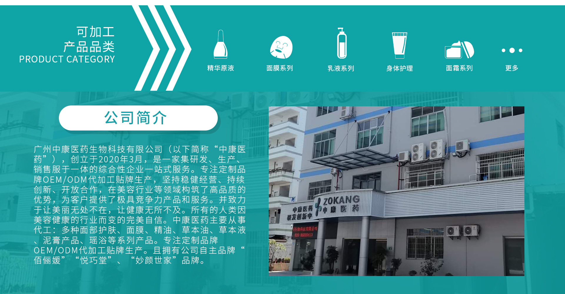 廣州中康醫藥生物科技有限公司(以下簡稱“中康醫藥”),創立于2020年3月,是一家集研發、生產、銷售服于一體的綜合性企業一站式服務。專注定制品牌OEM/ODM代加工貼牌生產,堅持穩健經營、持續創新、開放合作,在美容行業等領域構筑了高品質的優勢,為客戶提供了極具競爭力產品和服務。并致力于讓美麗無處不在,讓健康無所不及。所有的人類因美容健康的行業而變的完美自信。中康醫藥主要從事代工:洗面奶、卸妝水、面膜、精華、原液、乳液、膏霜、精油、美白淡斑產品、減肥產品、養生產品、隔離防曬、手霜、護發素、瑤浴、沐浴、面膜粉、中藥膜粉、定妝散粉、彩妝、口紅、私秘抑菌護理等系列產品。為眾多品牌商、美容連鎖機構、微商電商、開發商提供高效、新穎、獨特、尖端的綠色環保系列產品。專注定制品牌OEM/ODM代加工貼牌生產