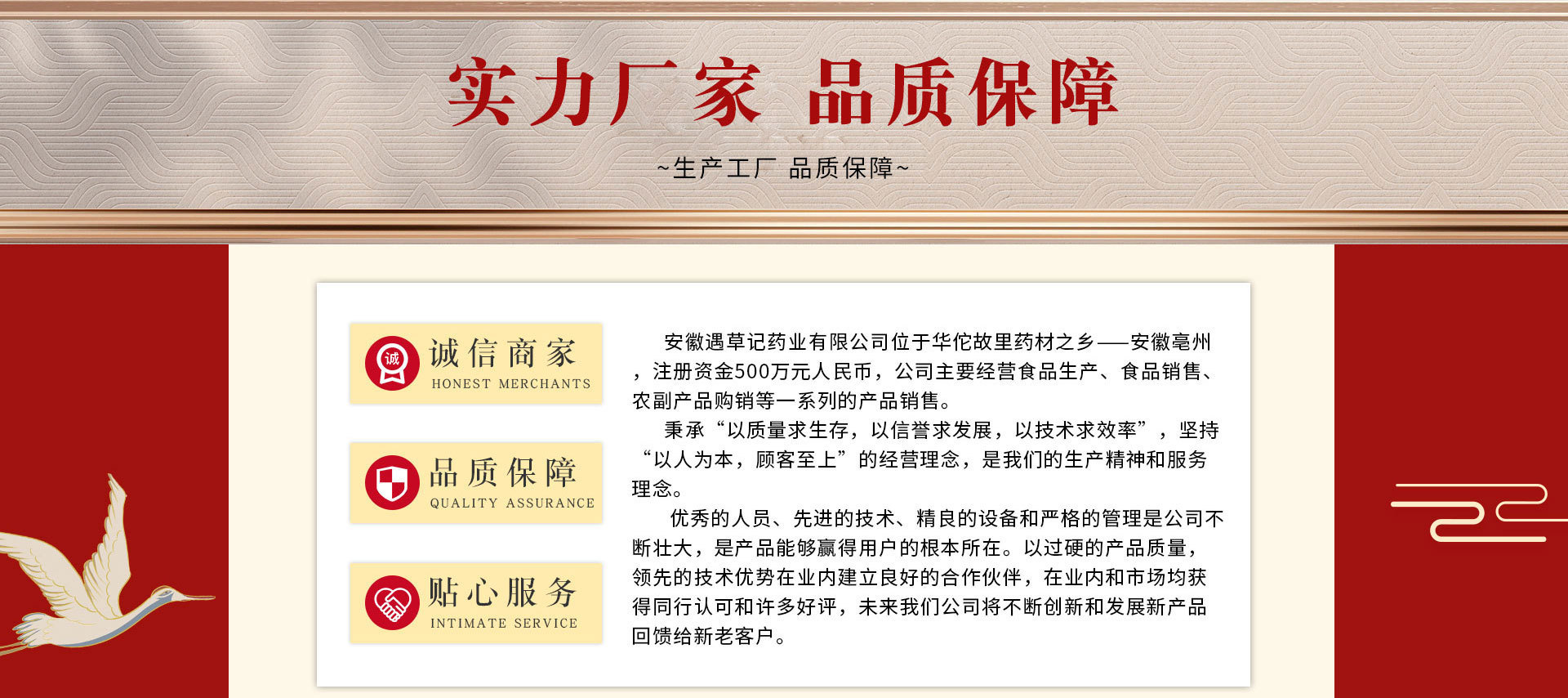 安徽遇草記藥業有限公司是酸棗仁膏、人參五寶茶、菊花決明子茶、山楂六物膏、枇杷秋梨膏等產品專業生產加工的公司,擁有完整、科學的質量管理體系。安徽遇草記藥業有限公司的誠信、實力和產品質量獲得業界的認可。歡迎各界朋友蒞臨參觀、指導和業務洽談。