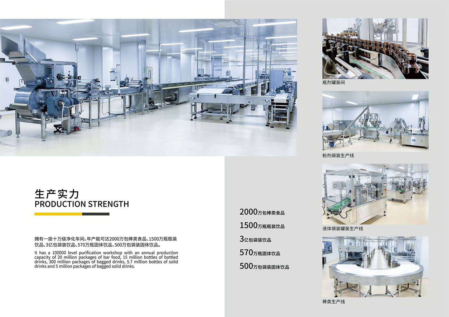 擁有一座十萬級(jí)凈化車間,年產(chǎn)能可達(dá)2000萬包棒類食品、1500萬瓶瓶裝飲品、3億包袋裝飲品、570萬瓶固體飲品、500萬包袋裝固體飲品。