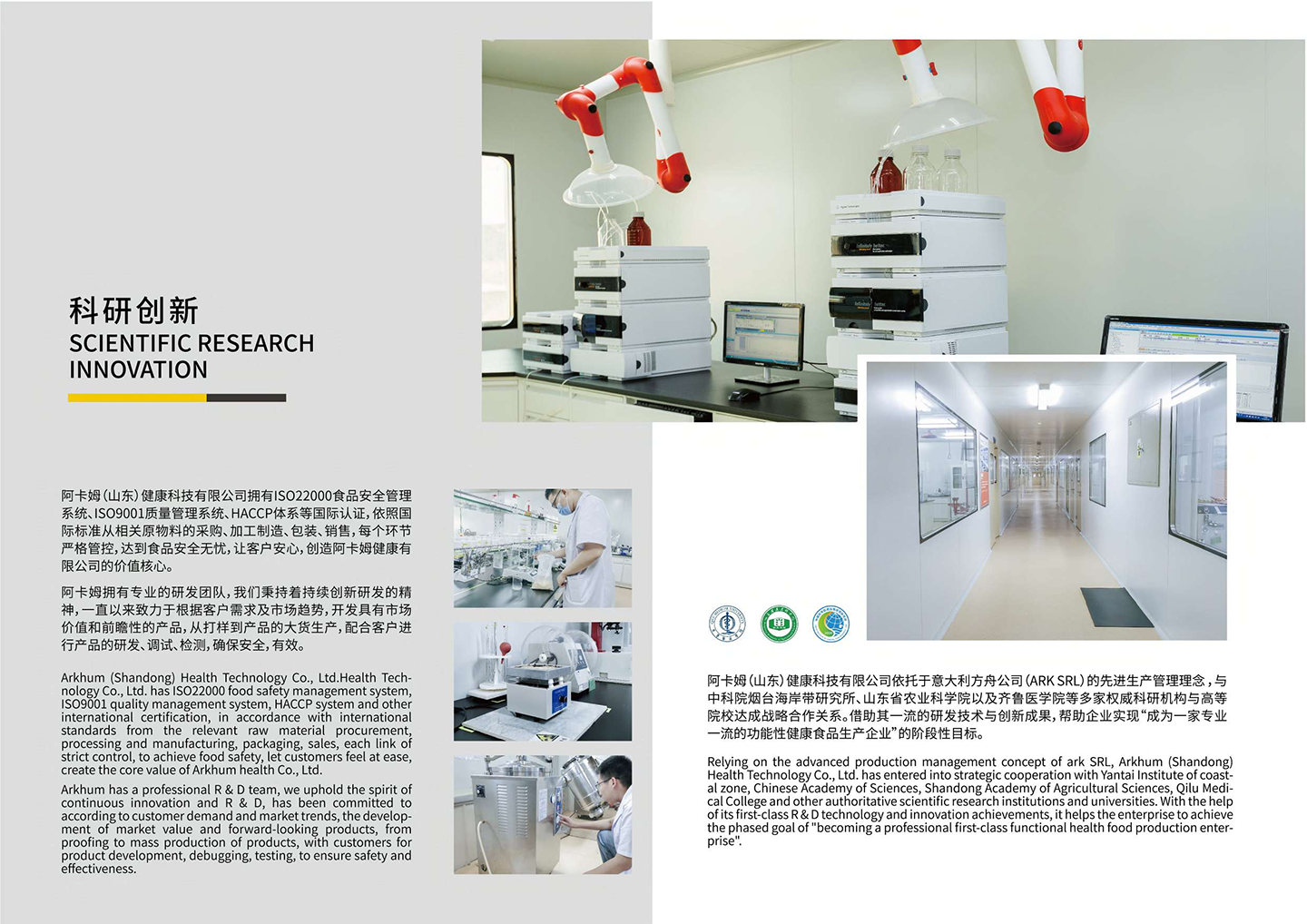 阿卡姆(山東)健康科技有限公司依托于意大利方舟公司(ARK SRL)的先進(jìn)生產(chǎn)管理理念,與中科院煙臺(tái)海岸帶研究所、山東省農(nóng)業(yè)科學(xué)院以及齊魯醫(yī)學(xué)院等多家權(quán)威科研機(jī)構(gòu)與高等院校達(dá)成戰(zhàn)略合作關(guān)系。借助其一流的研發(fā) 技術(shù)與創(chuàng)新成果,幫助企業(yè)實(shí)現(xiàn)“成為一家專業(yè)一流的功能性健康食品生產(chǎn)企業(yè)”的階段性目標(biāo)。