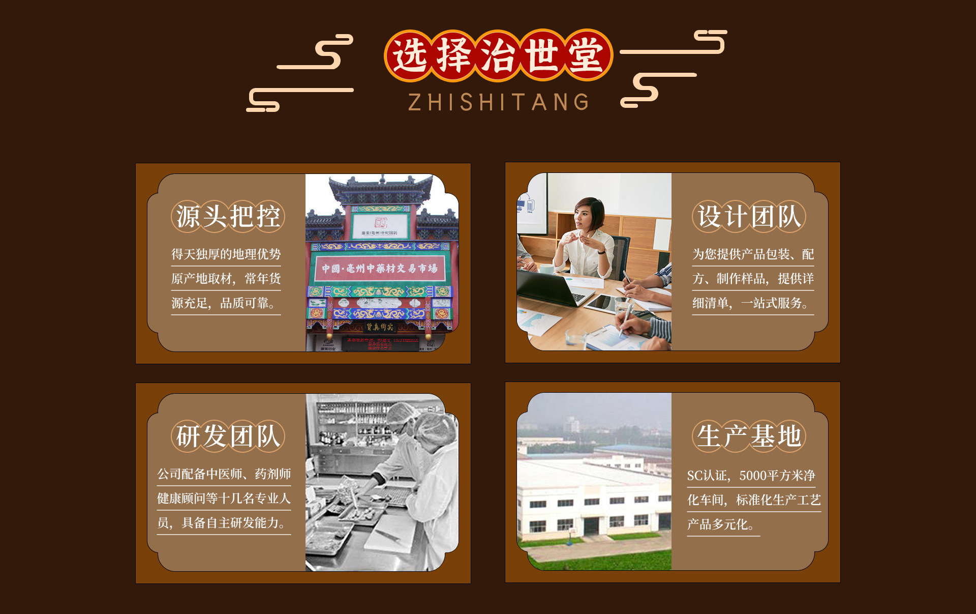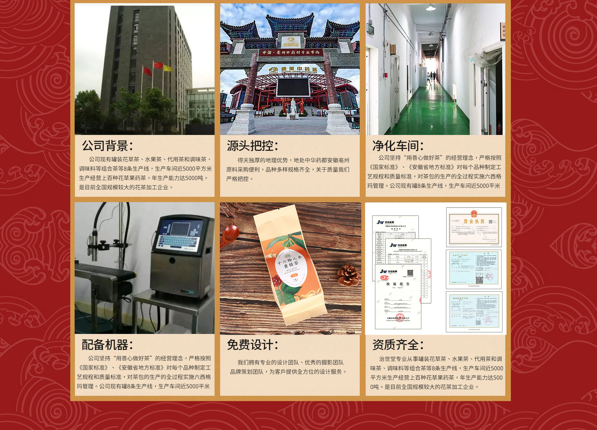 安徽省治世堂藥業有限公司坐落于中國最大的藥材集散地神醫華佗的故鄉和中醫藥文化的發祥地之一亳州,素有"中華藥都之稱"。本公司專業生產花草茶,水果茶,調味茶、固體飲料、方便食品的源頭廠家,專業代加工生產、OEM貼牌生產、一件代發、網紅直播帶貨、擺攤拿貨、支持微商,淘寶,京東,拼多多分銷、線下實體商超鋪貨以及批發,零售。公司有有專業的產品研發團隊,擁有2000平方的專業廠房面積。長期員工人數達到150人左右。有配套的物流鏈,發貨方便。