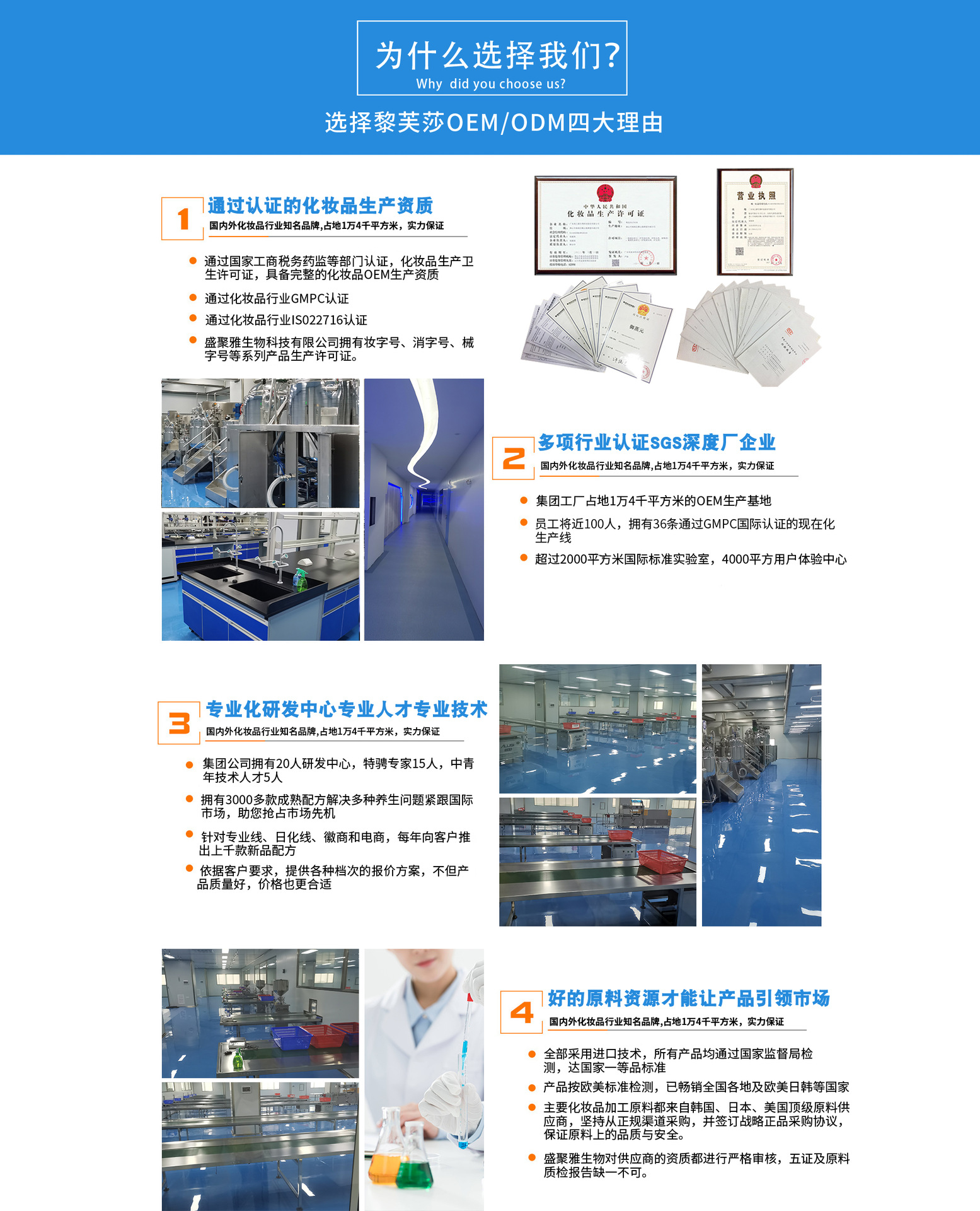 廣州黎芙莎化妝品有限公司是一家集研發、生產、批發、加工為一體的美容護膚公司。公司自有工廠,獨立的產品研發團隊,現代化的生產機械設備,擁有完整科學的質量管理體系。生產基地面積10000多平方米,廠房建設嚴格按照國家藥檢質量檢測標準執行,生產及衛生許可均達國家化妝品廠生產經營標準。 公司核心熱銷產品主要為面膜、潔面乳、精華液、保濕霜、BB霜、防曬霜、防曬乳、美白面膜、身體乳、潔面乳、水乳霜膏、泥膜、護手霜、爽膚水、化妝水、護膚品套裝等產品和加工原料。公司旗下品牌有:黎芙莎、雪彌、媚顏堂、吉舒。 廣州黎芙莎化妝品有限公司一直秉持“誠信為本,客戶至上”的宗旨,本著“品質為本,精益求精”的經營銷售理念,獲得了業界客戶的認可和贊譽,也使公司得到持續的發展。期待與各位業界新老客戶攜手共進,共贏輝煌未來!