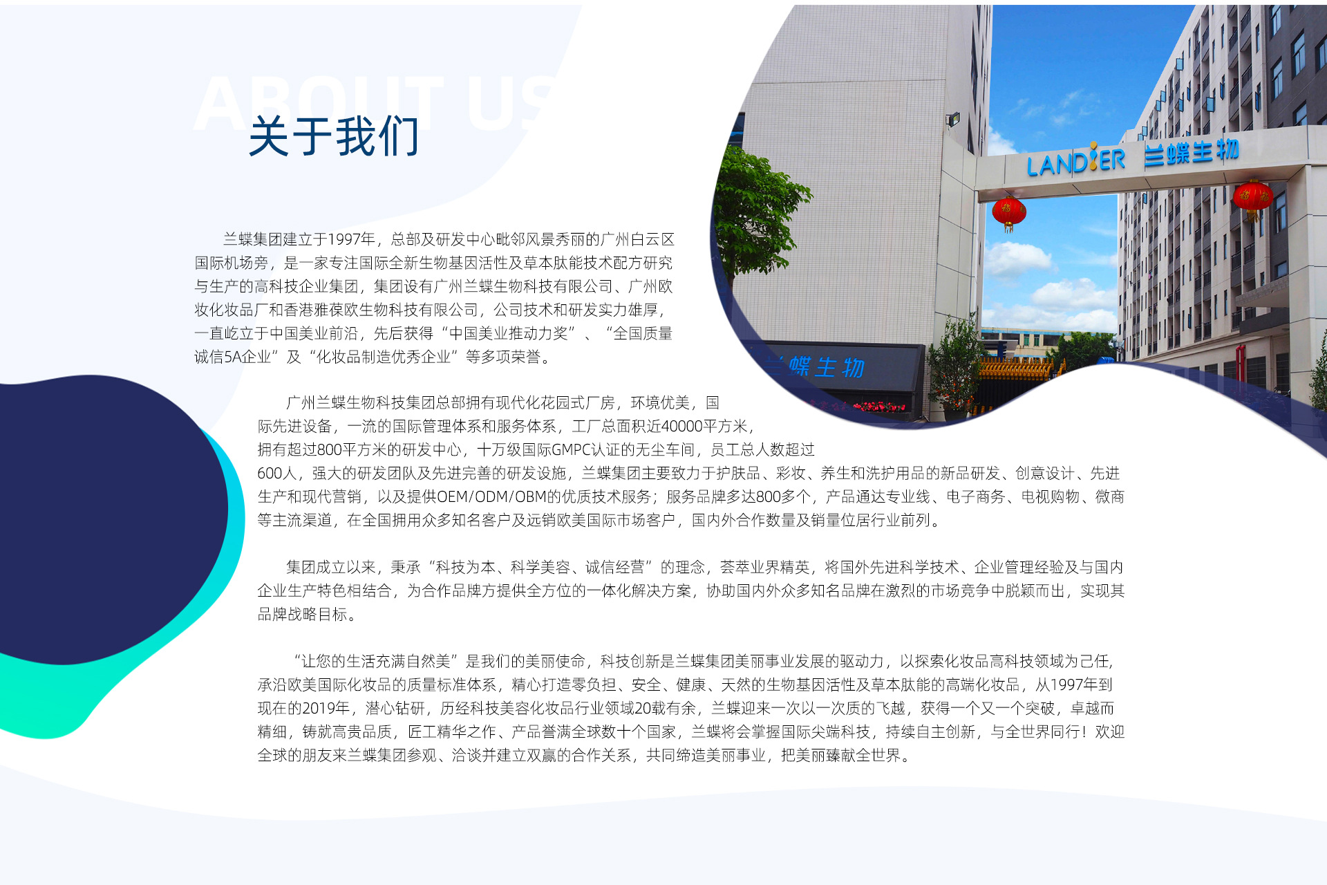 蘭蝶集團建立于1997年,總部及研發中心毗鄰風景秀麗的廣州白云區國際機場旁,是一家專注國際全新生物基因活性及草本肽能技術配方研究與生產的高科技企業集團,集團設有廣州蘭蝶生物科技有限公司、廣州市白云區歐妝化妝品廠、廣州名嬌生物科技有限公司、廣州戀蘭蝶生物技術有限公司、廣州戀蘭蝶品牌管理有限公司、廣州戀蘭蝶文化傳媒有限公司,公司技術和研發實力雄厚,一直屹立于中國美業前沿,先后獲得”中國美業推動力獎“、“全國質量誠信5A企業”及“化妝品制造優秀企業”等多項榮譽。